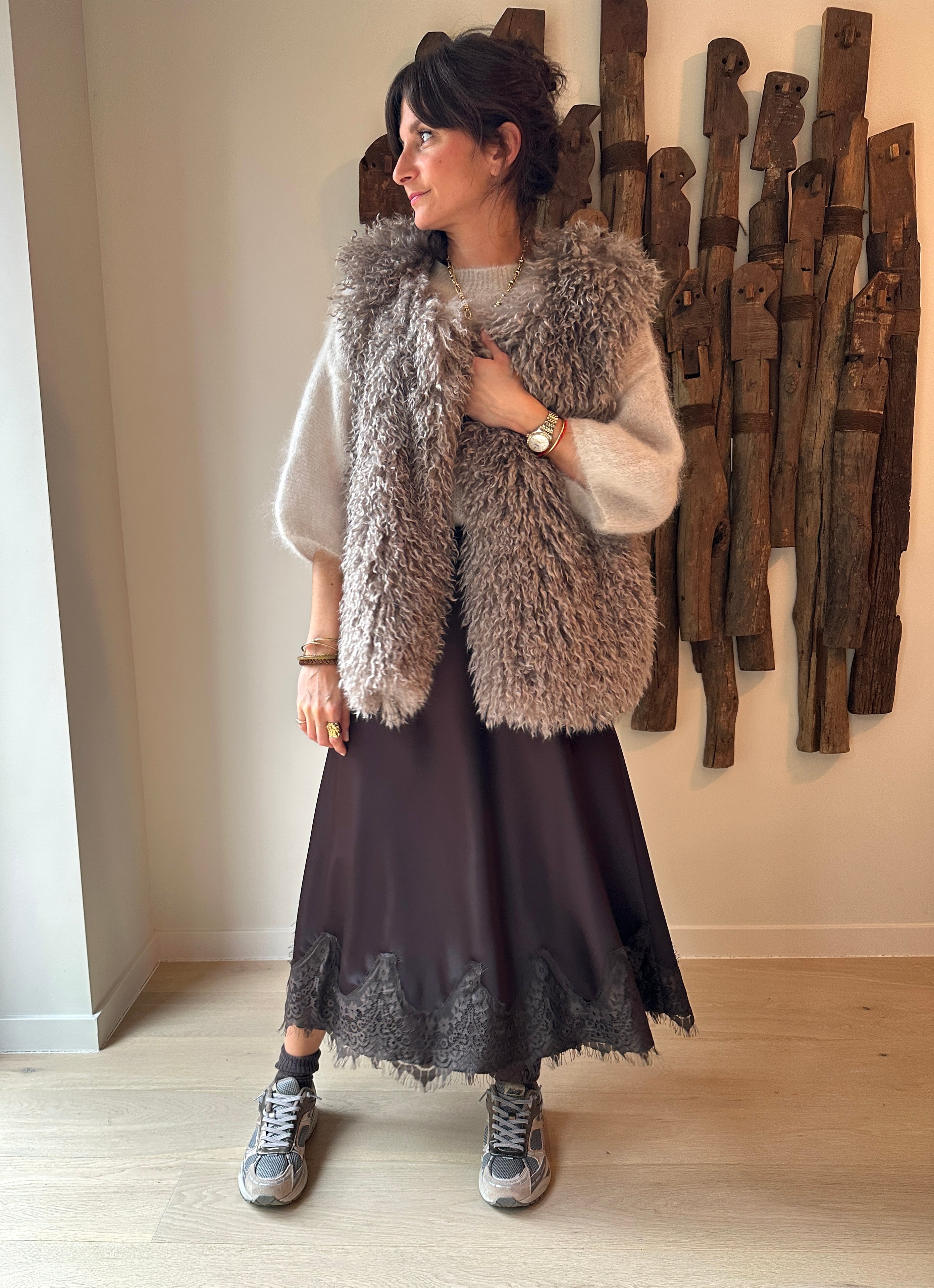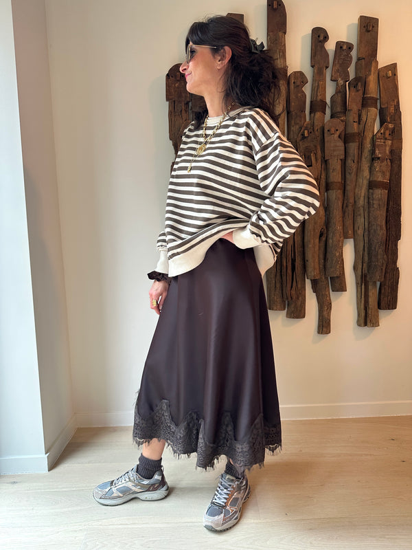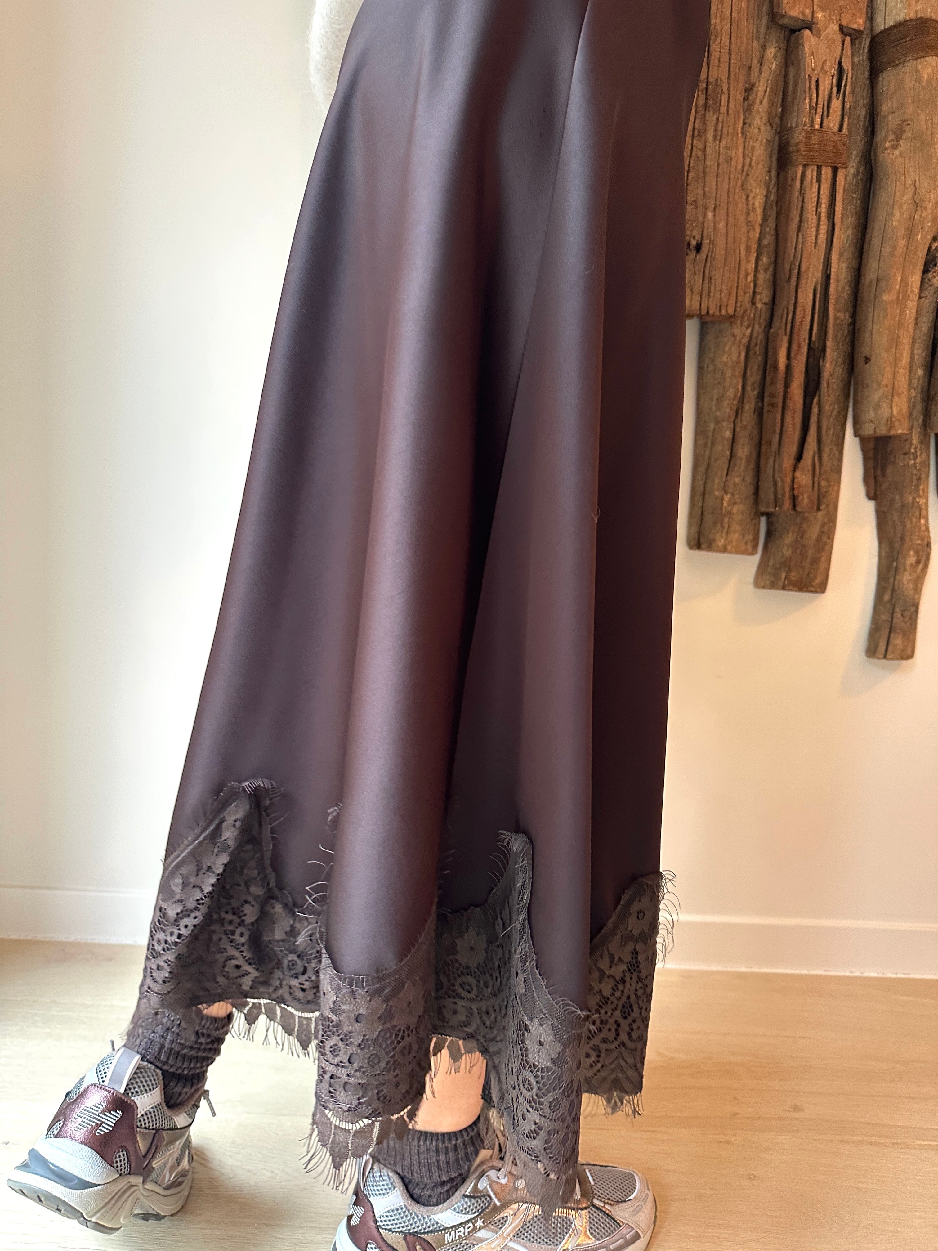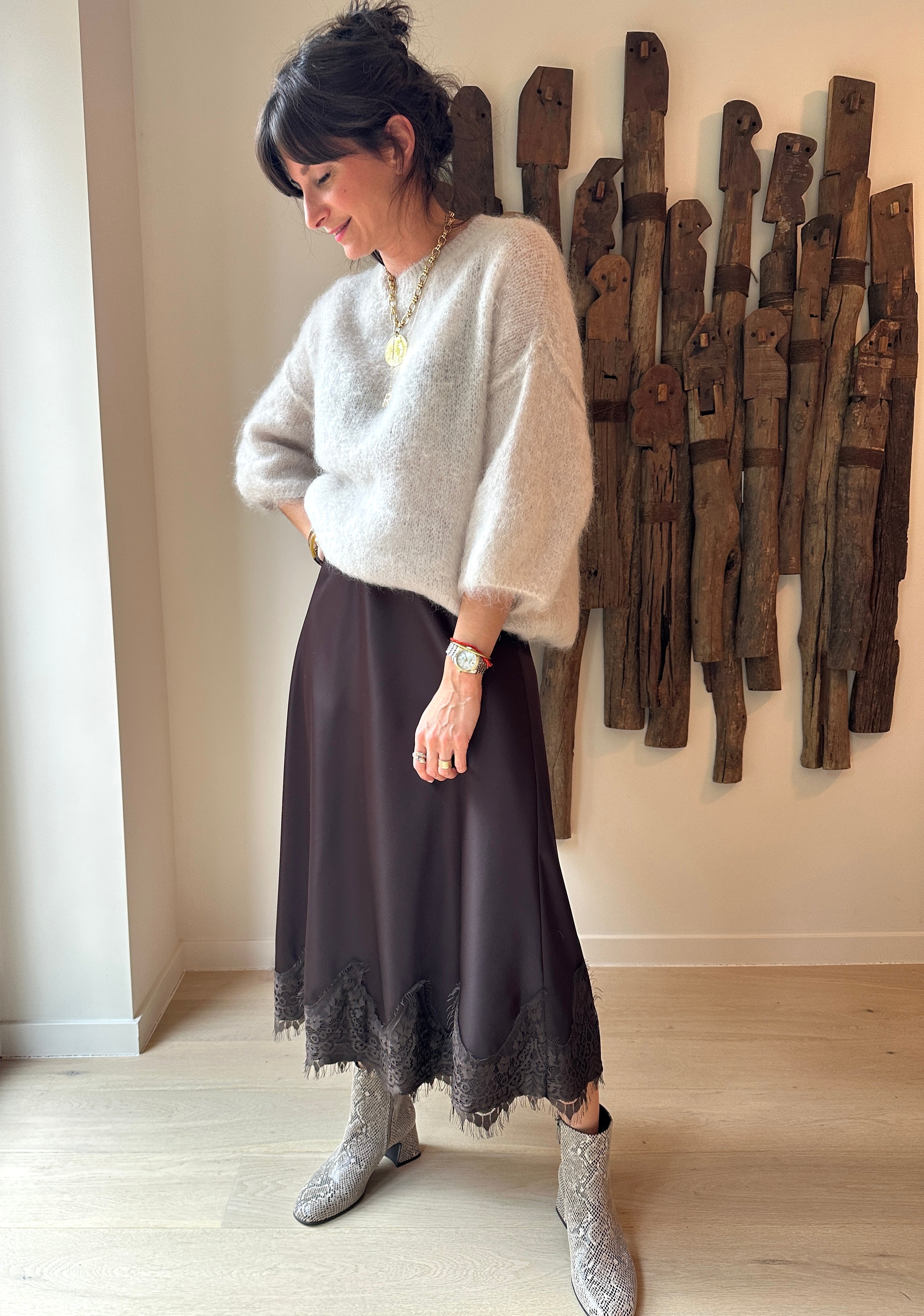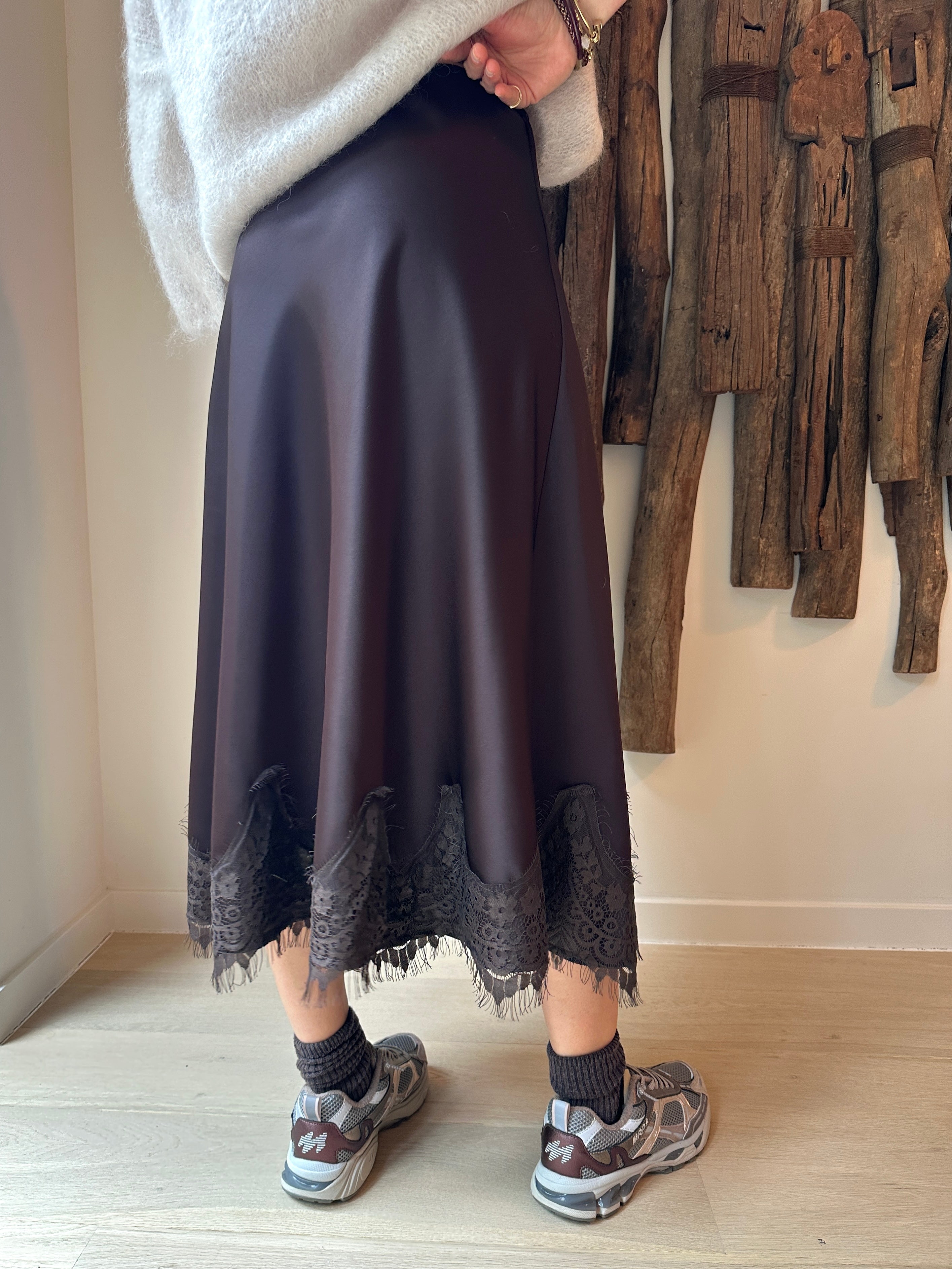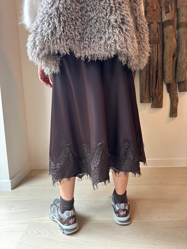 Description : Dans la tendance dentelle, voici la jupe. Super agréable à porter. Tissu épais qui ne marque pas. Elastique à la taille. Fabriqué en Italie. Taille unique.