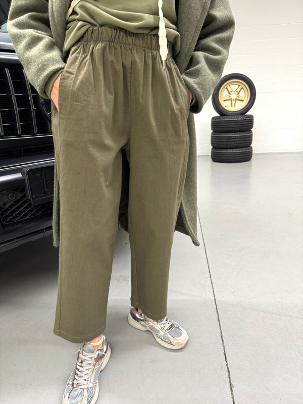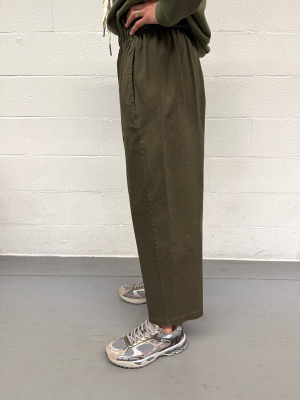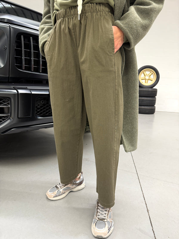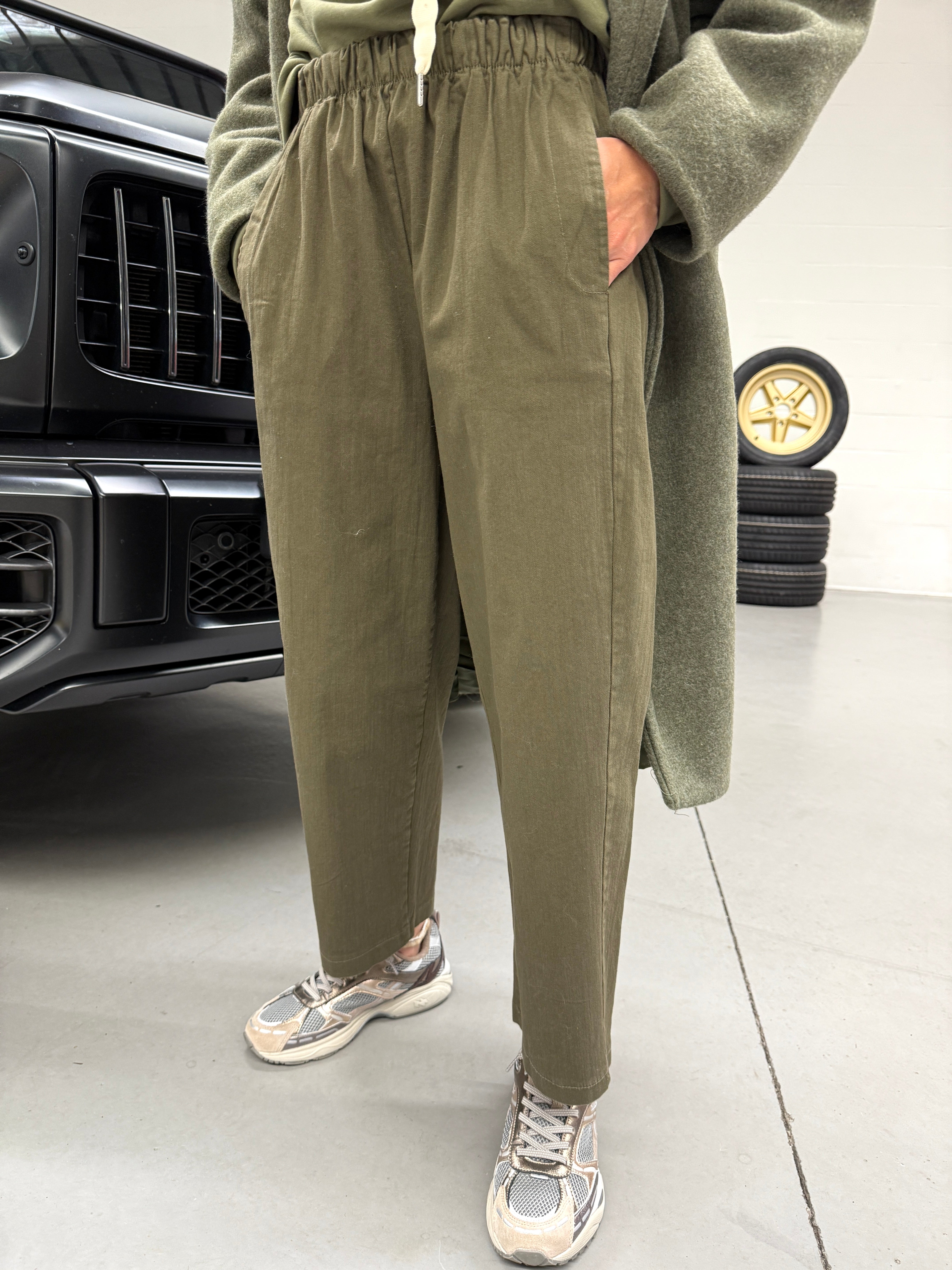 Description : Notre célèbre coupe de pantalon dit "magique" est ici décliné dans un tissu bien épais 100% coton. Disponible en chocolat et kaki. Elastique à la taille. Poches sur les côtés. Fabriqué en Italie. Taille unique. Coupe oversize.