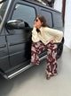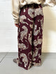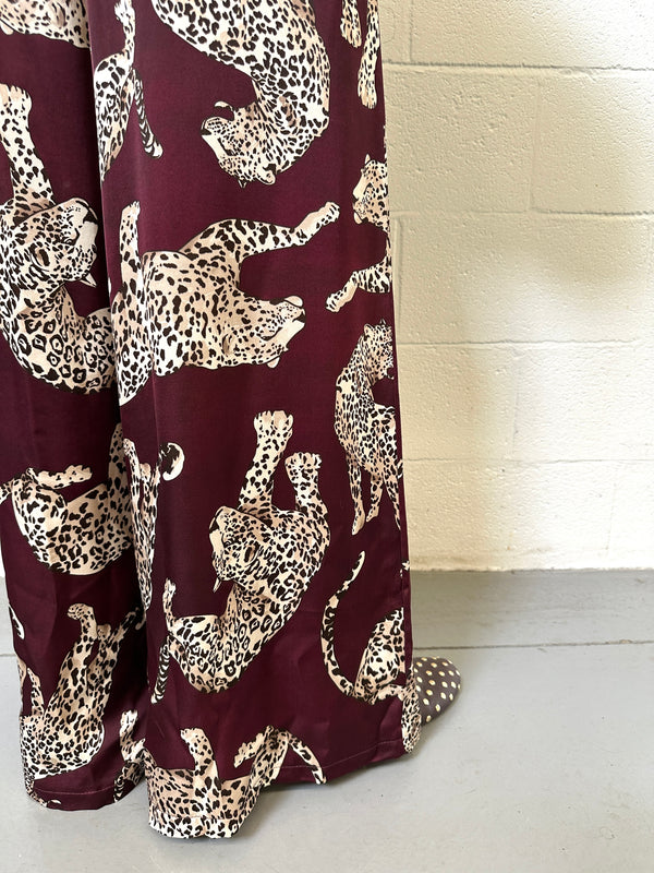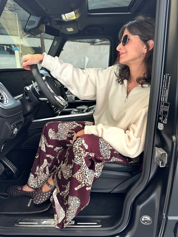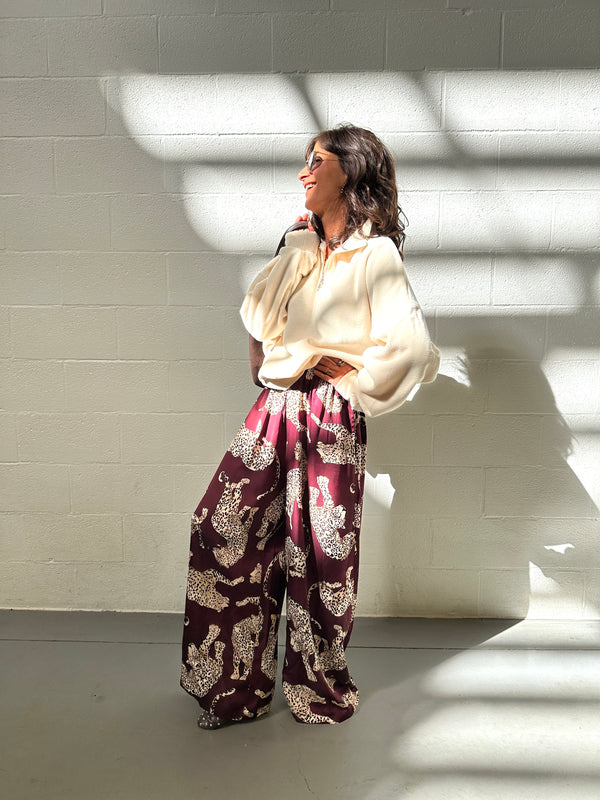 Description : Dans la même coupe que le pantalon python que vous avez adoré : le Pio avec son imprimé de léopard. Disponible en chocolat et en bordeaux. Elastique à la taille pour un super confort, poches sur les côtés. Fabriqué en Italie. Taille unique. Coupe oversize.