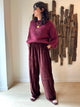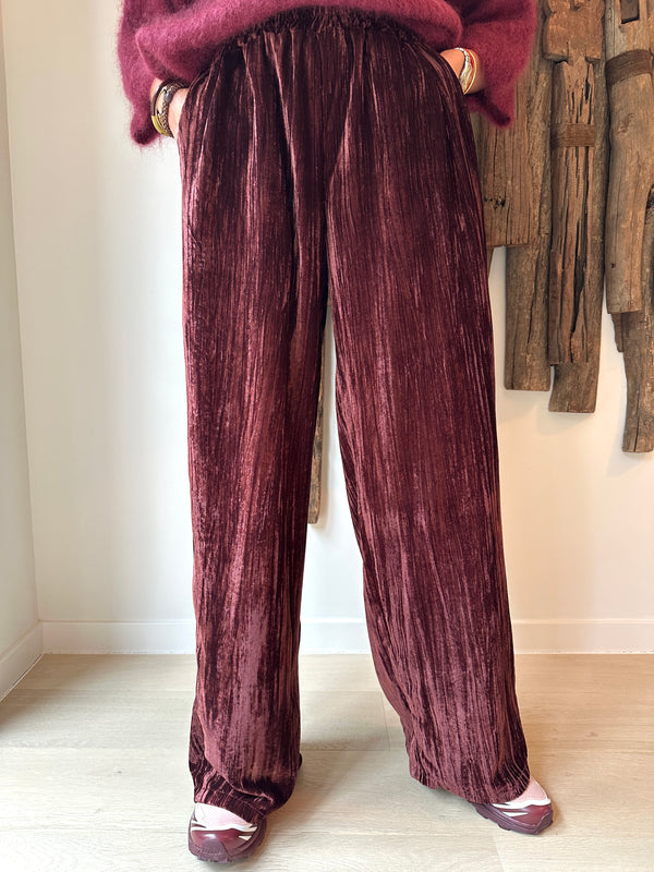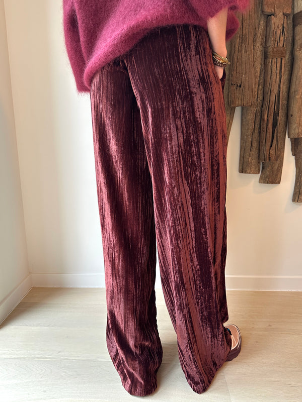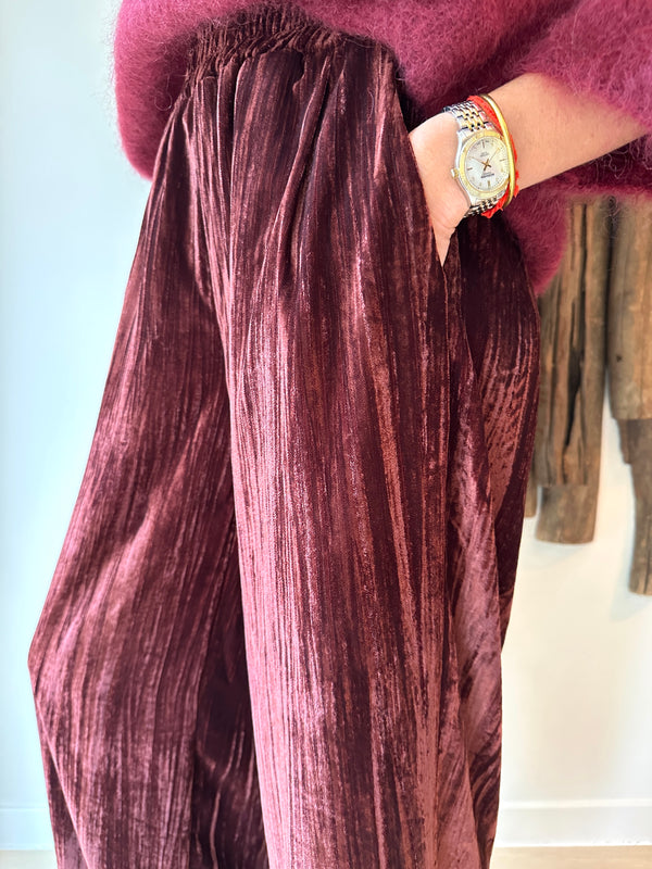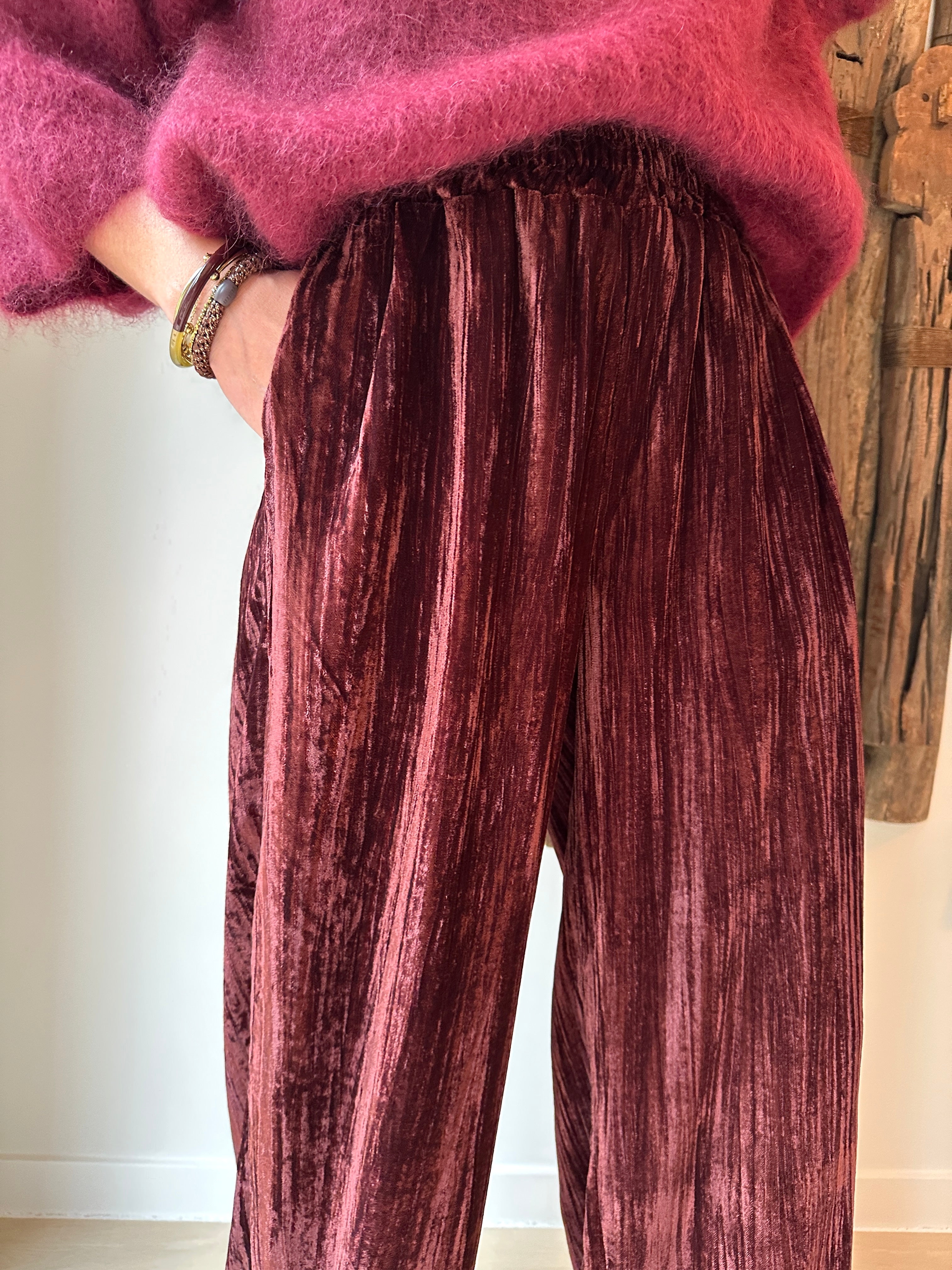 Description : Magnifique pantalon en velours lisse de couleur bordeaux. Très belle longueur de jambe ! Elastique à la taille. Poches sur les côtés. Fabriqué en Italie. Taille unique. Coupe oversize.