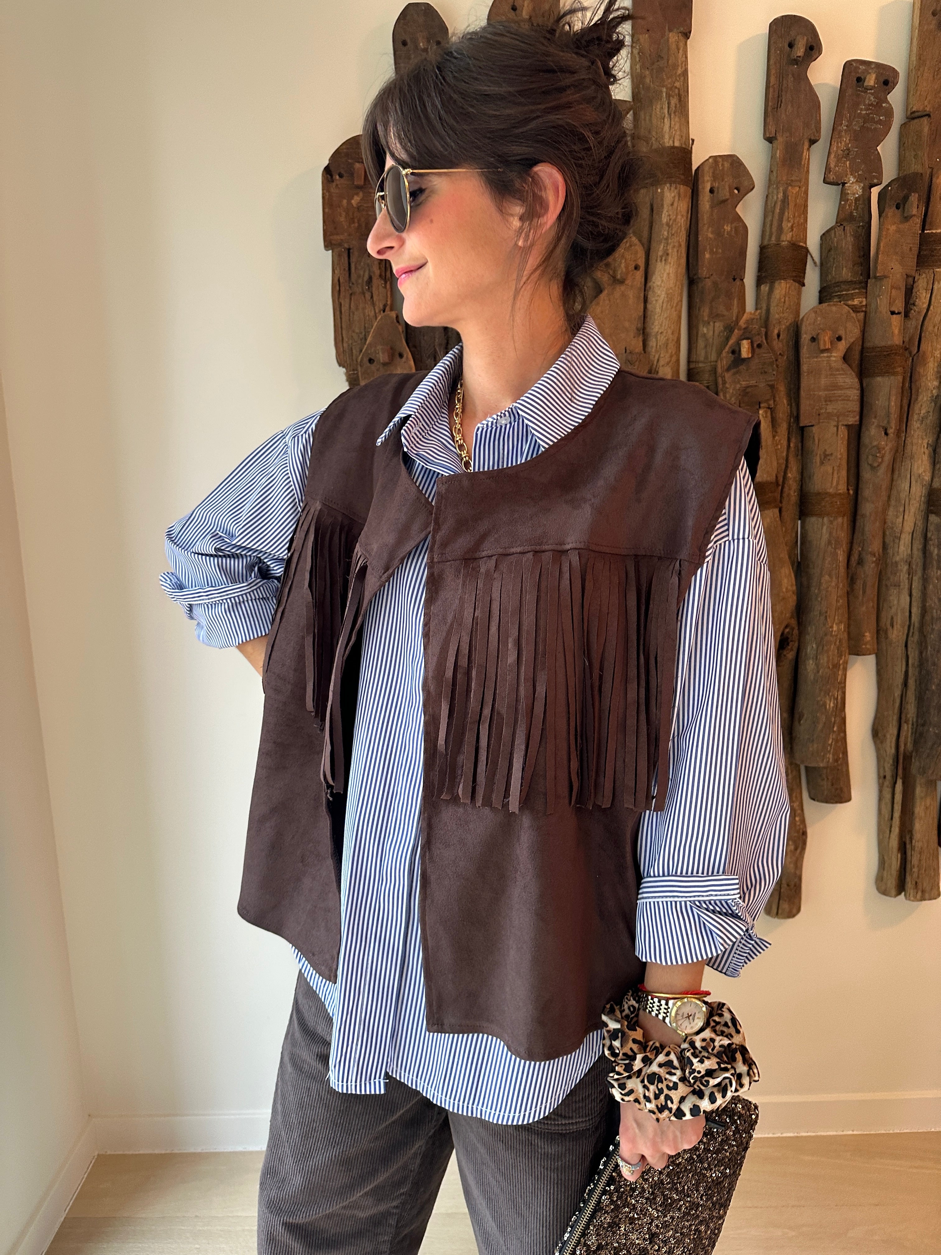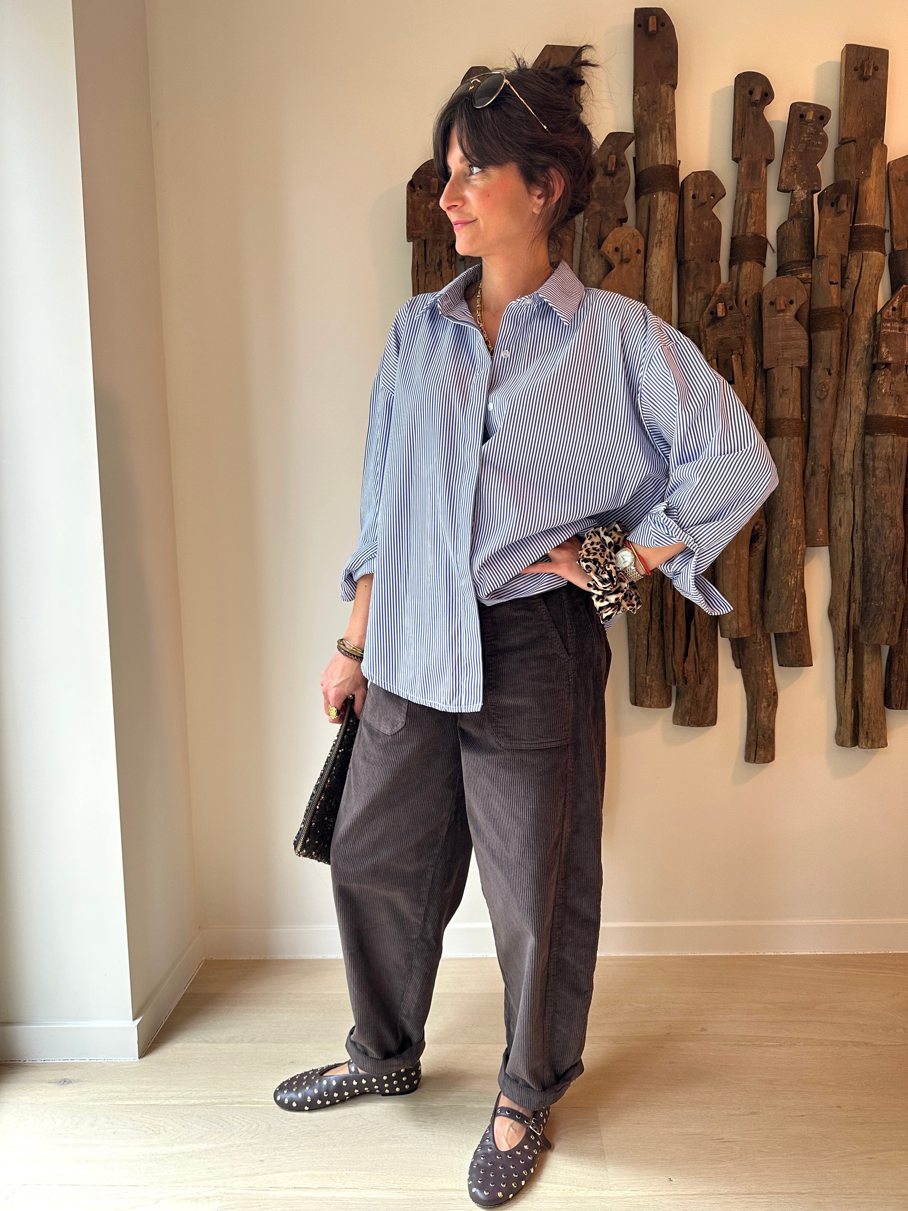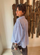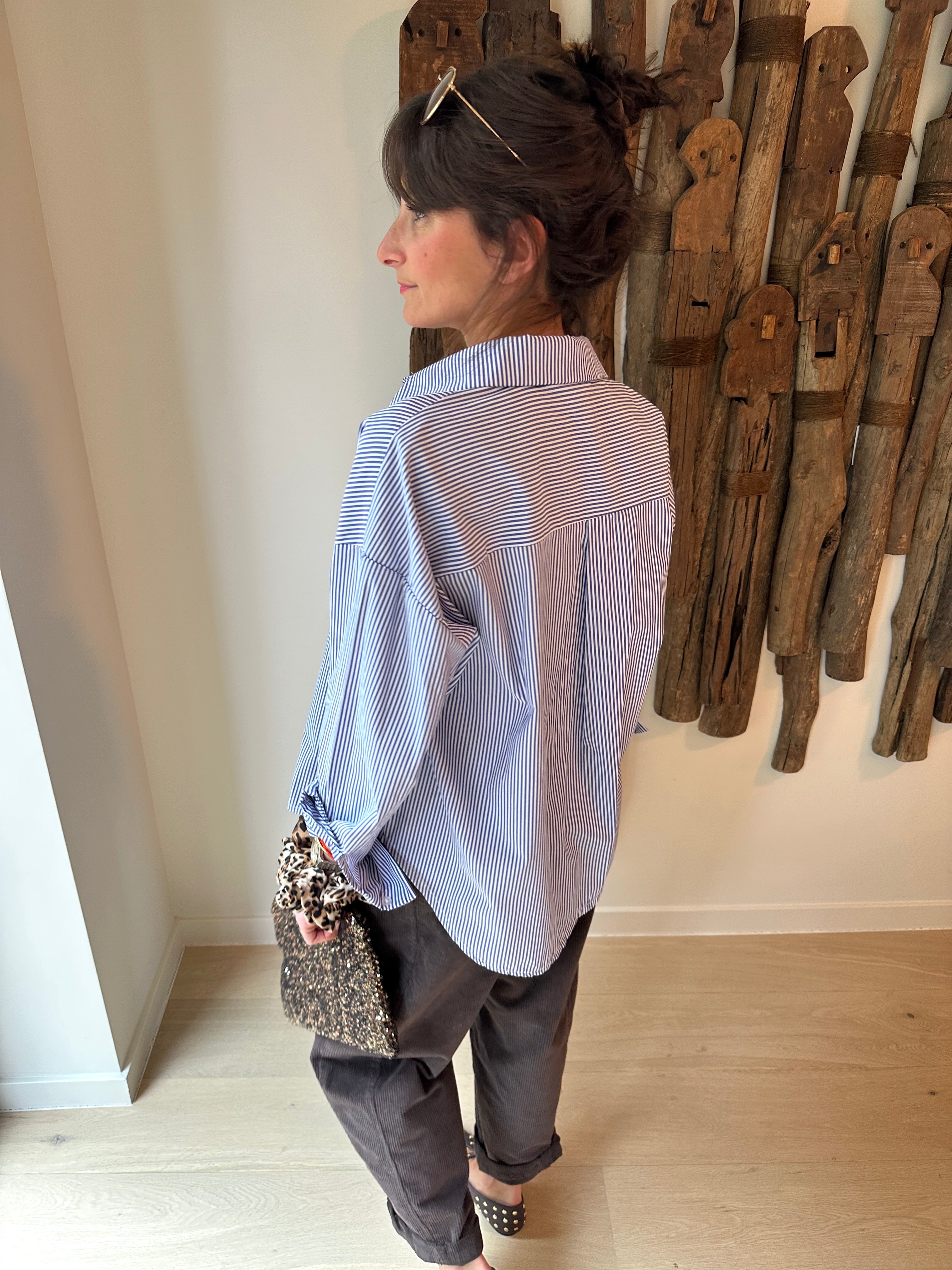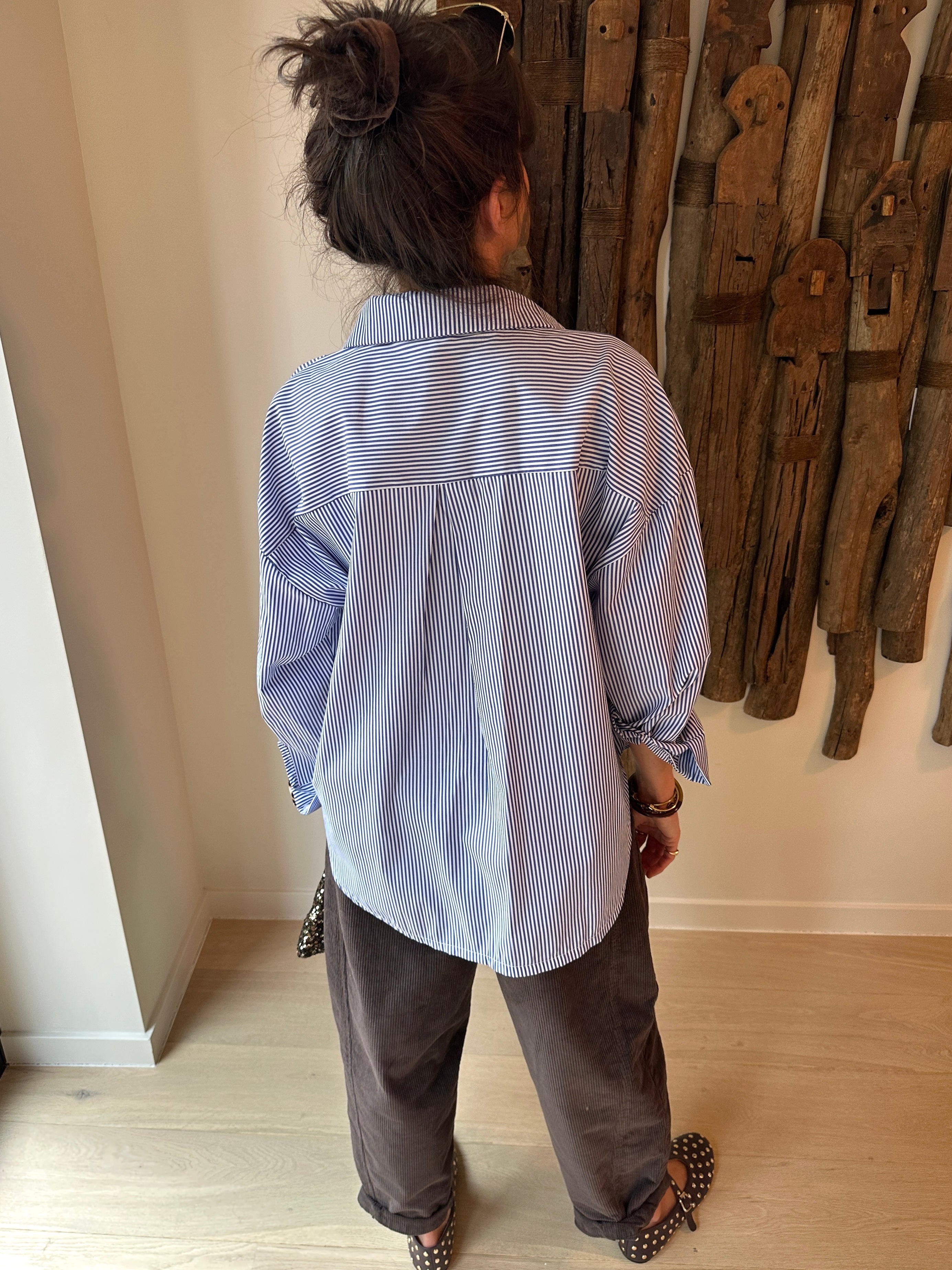 Description : A avoir dans sa garde-robe : la chemise oversize effet "je l'ai piquée à mon mec!". Ici déclinée avec lignes bleues et blanches. Fabriqué en Italie. Taille unique. Coupe oversize.