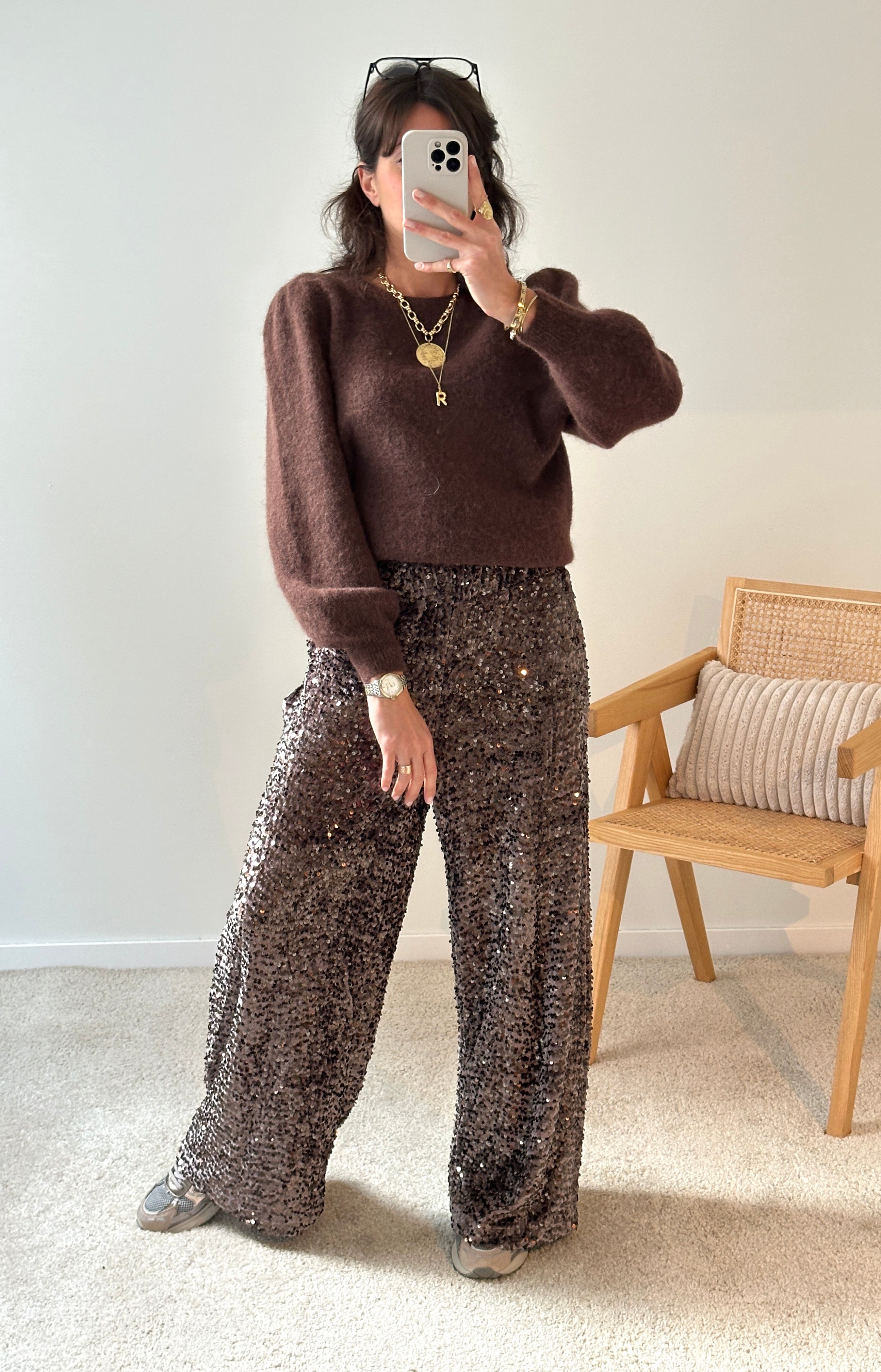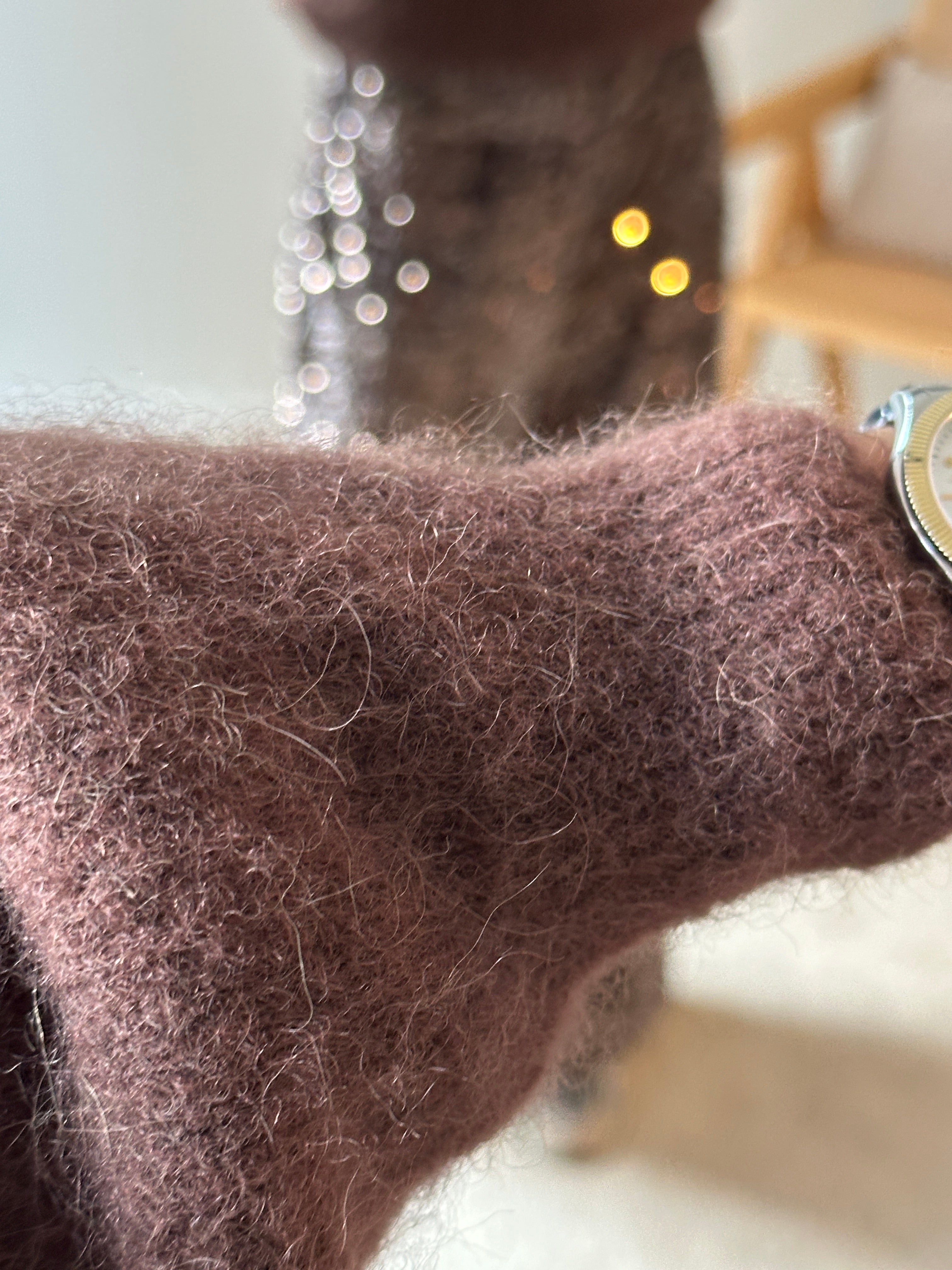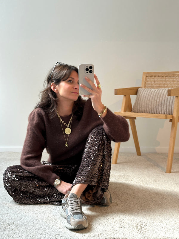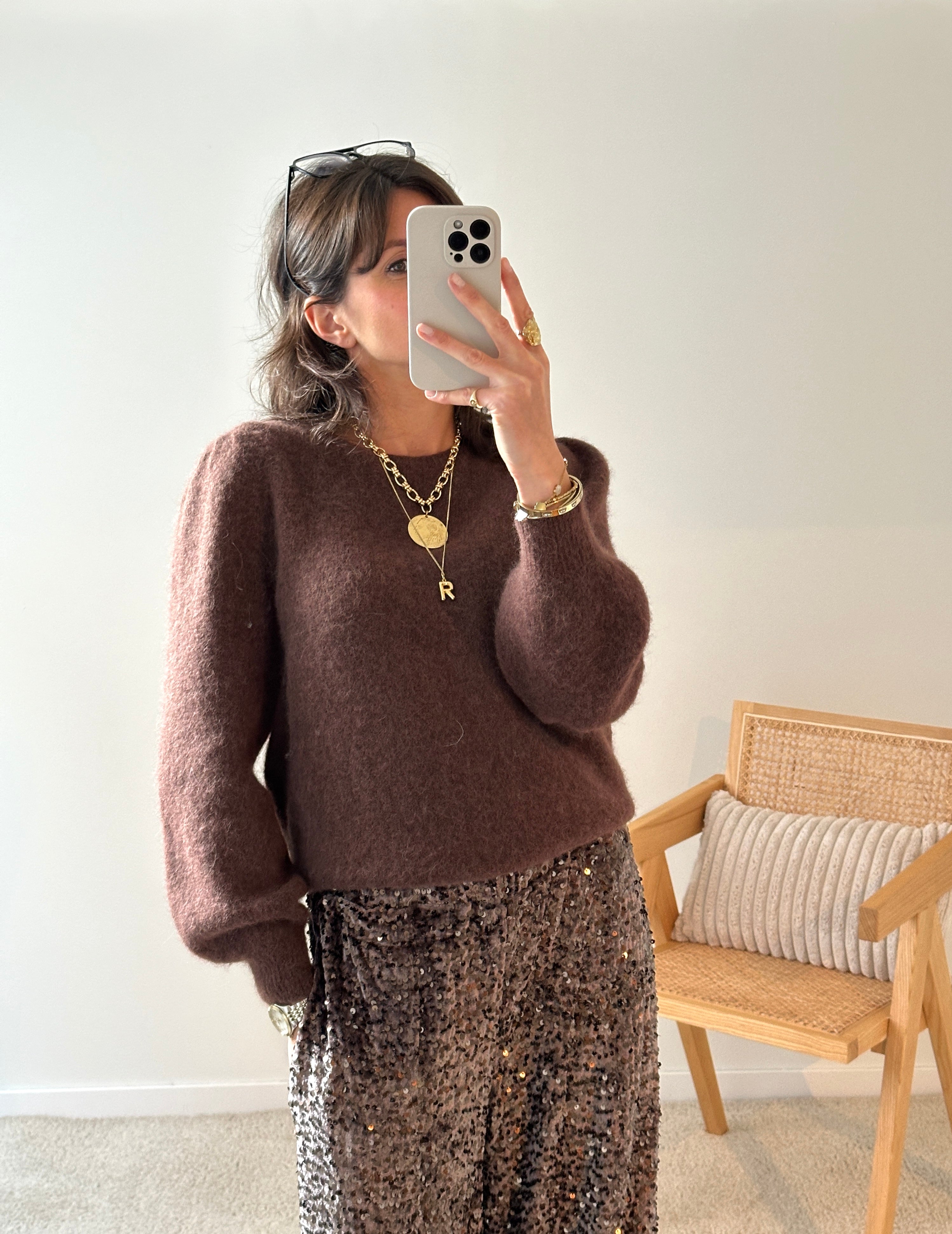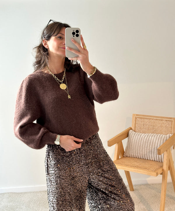 Description : Pull en maille de couleur marron avec manches ballons, ajustées aux poignets. Fabriqué en Italie. Taille unique.