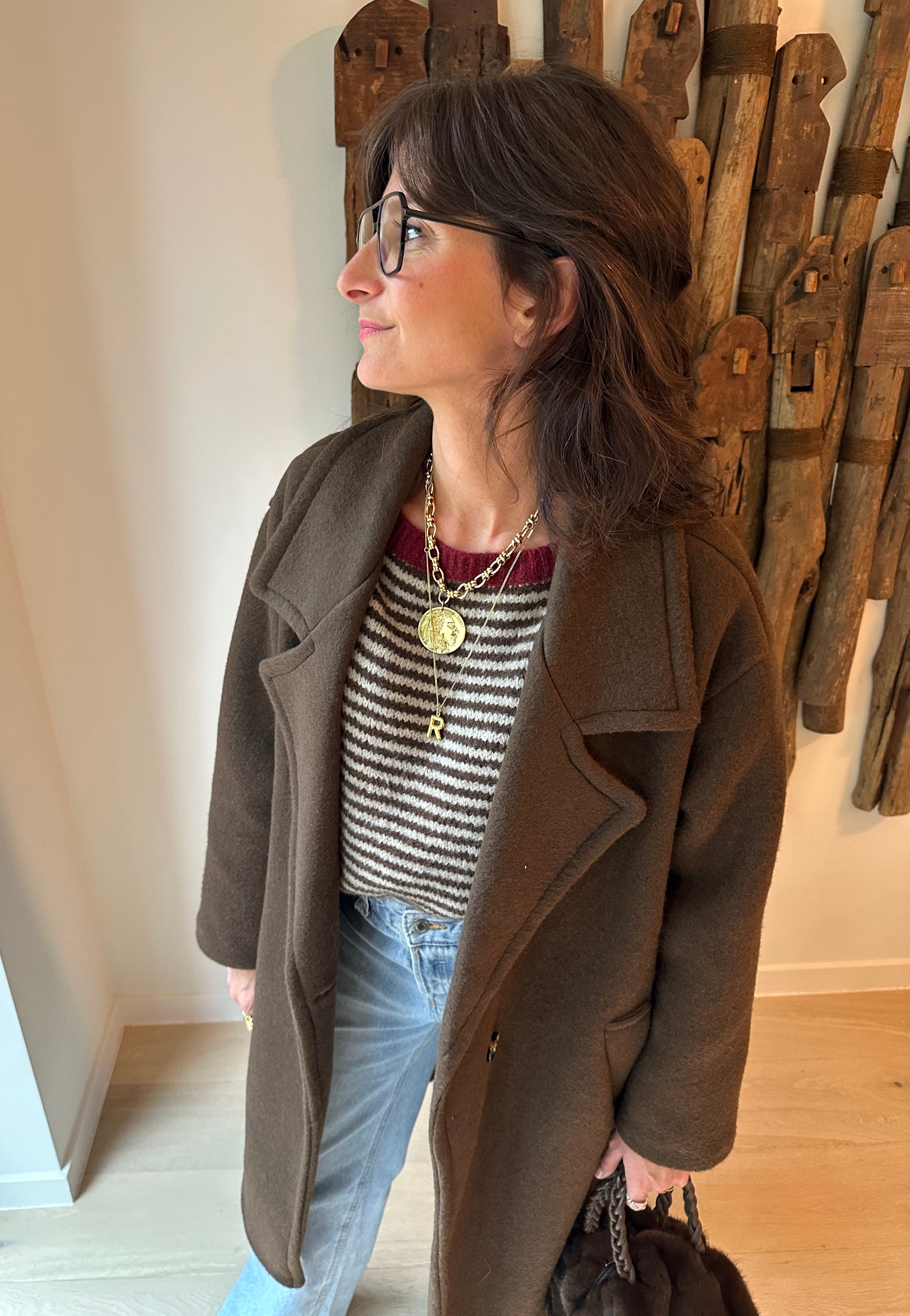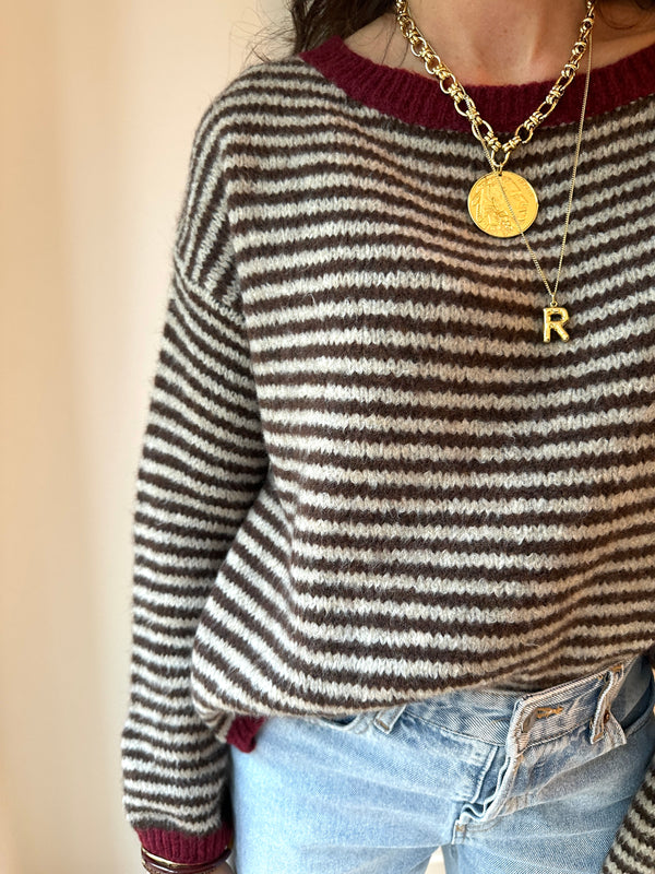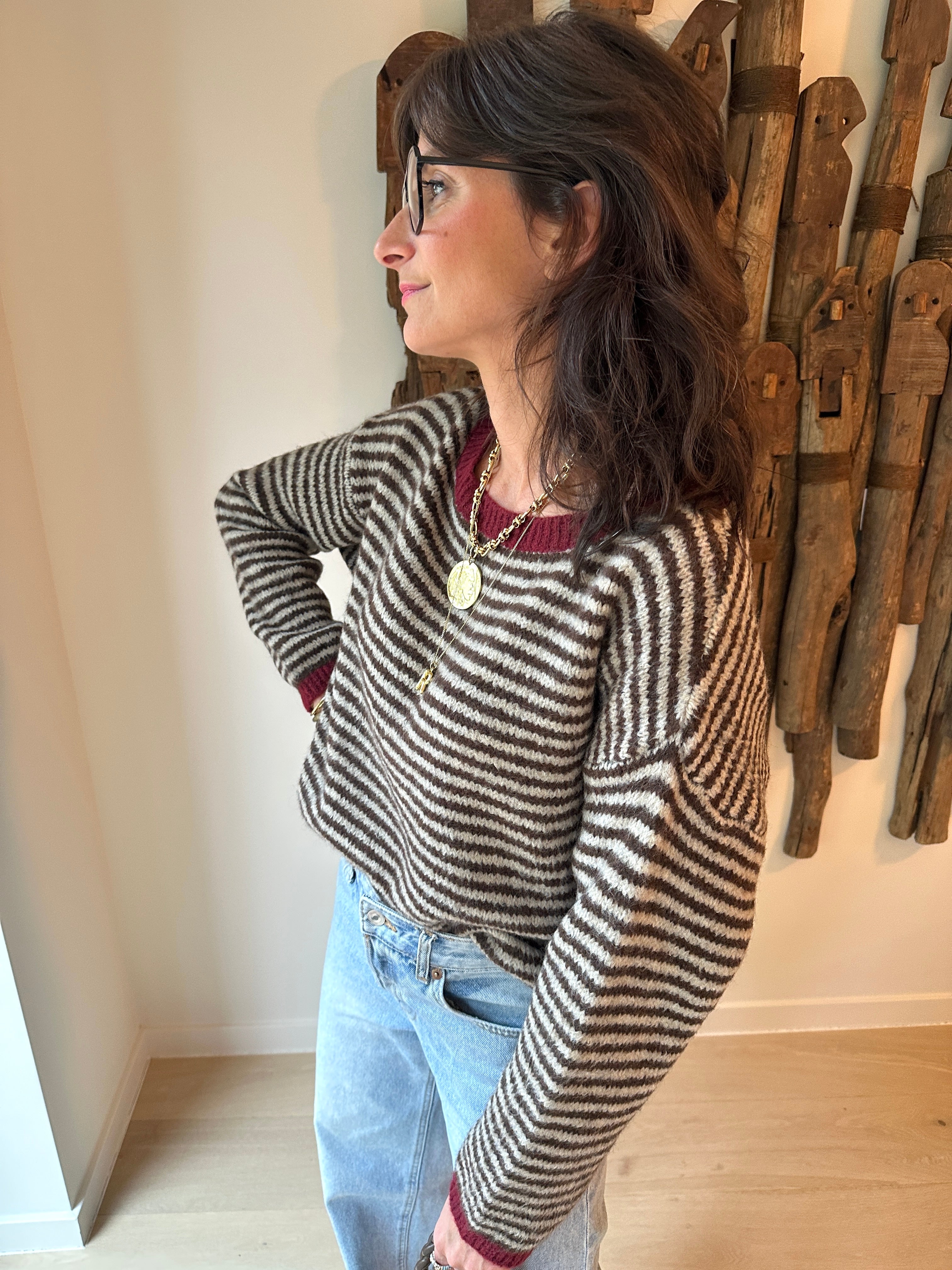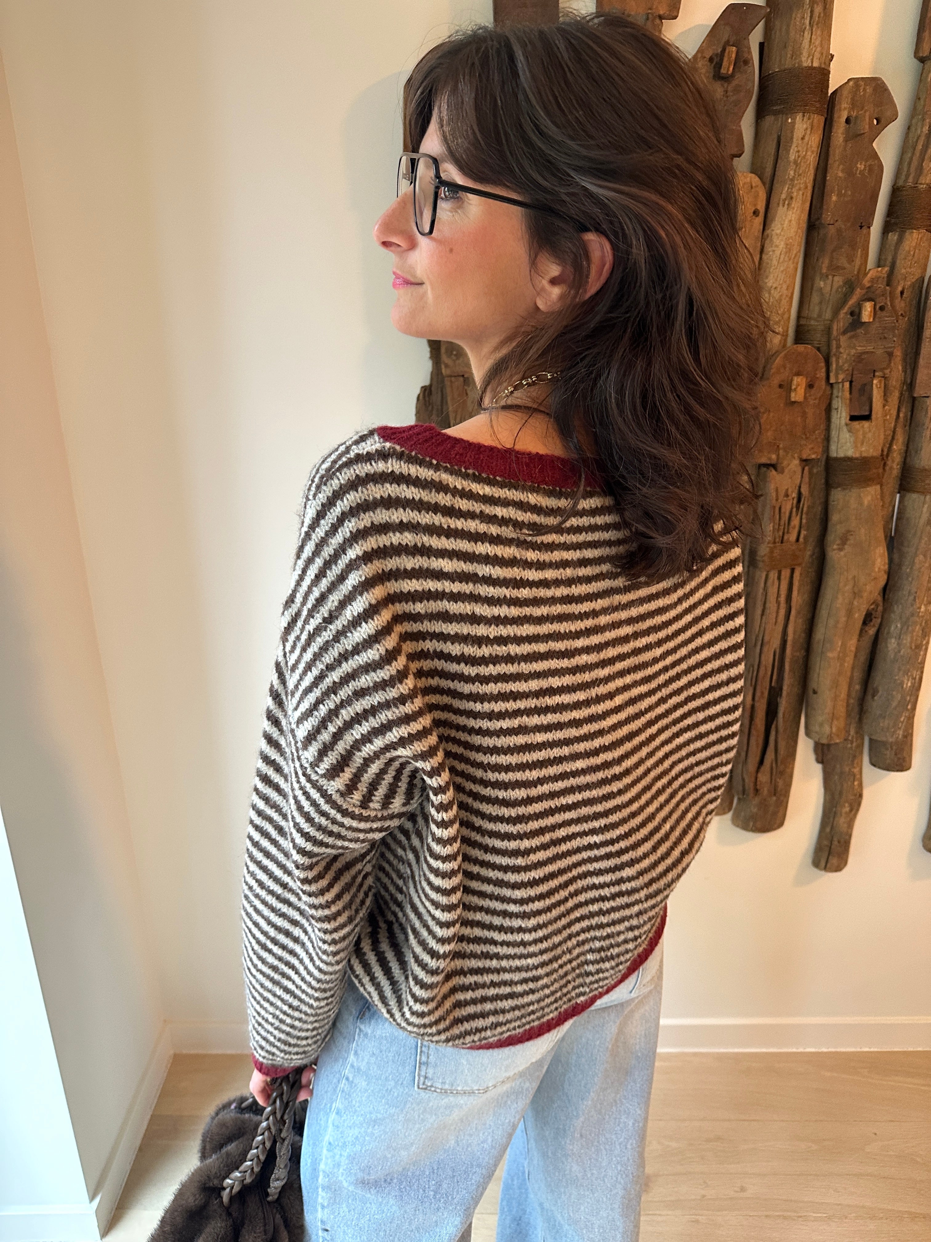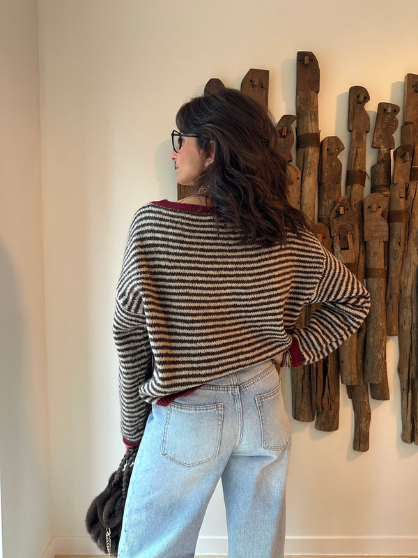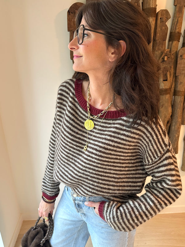 Description : Jolie maille marinière marron et beige avec col, poignets et bas de couleur bordeaux. Fabriquée en Italie. Taille unique. Coupe oversize.