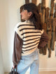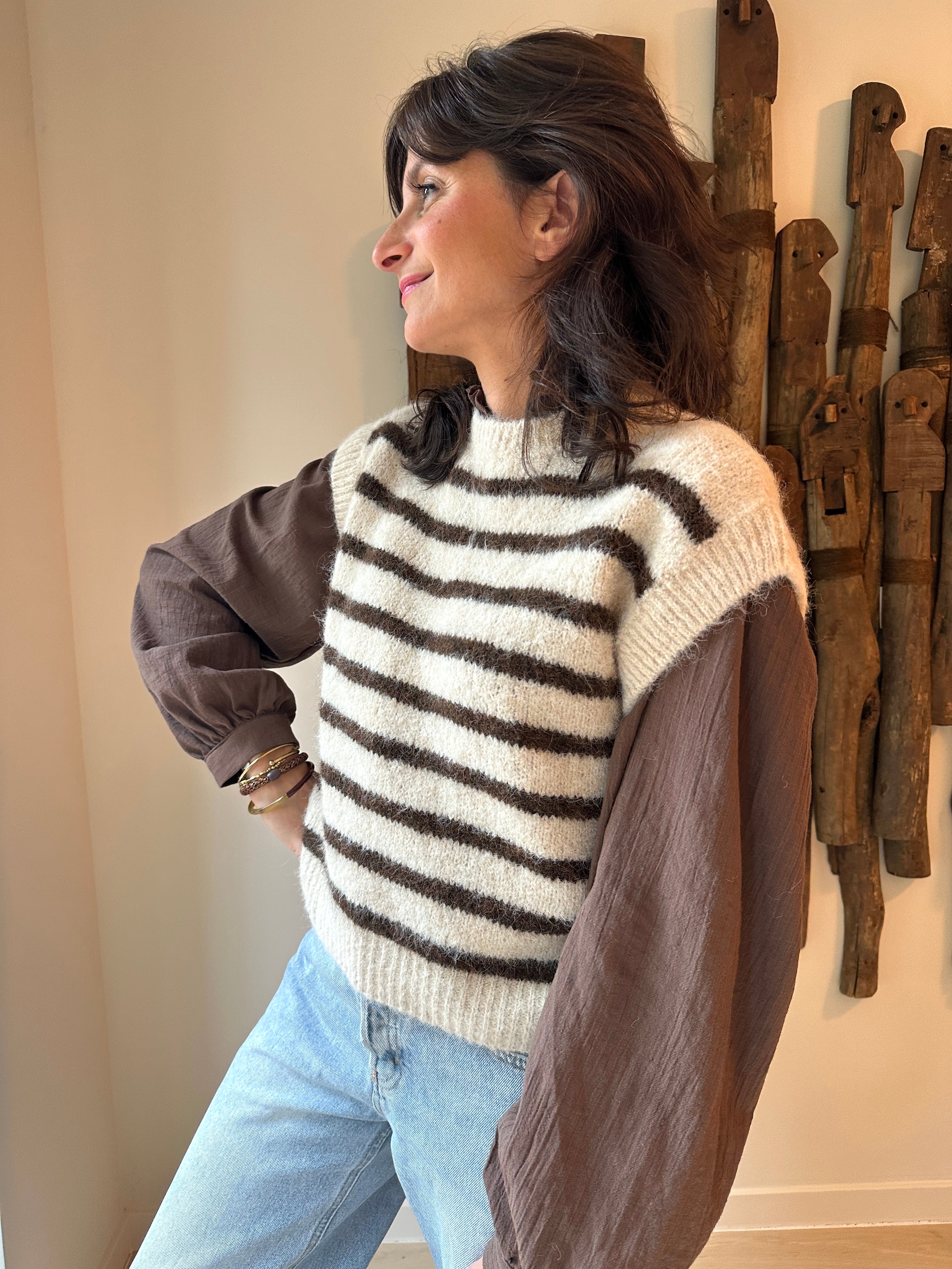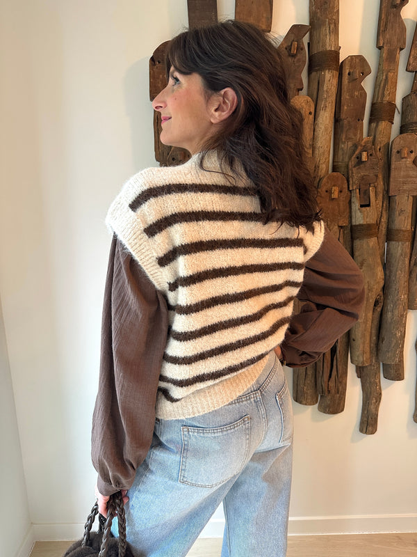 Description : Pull sans manche marin beige et marron. Fabriqué en Italie. Taille unique. Col légèrement montant.