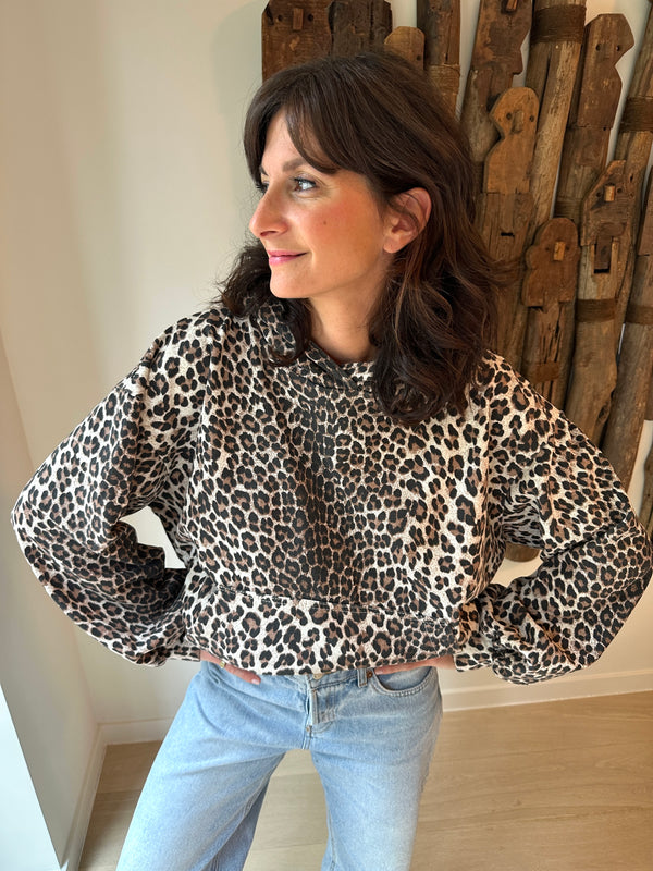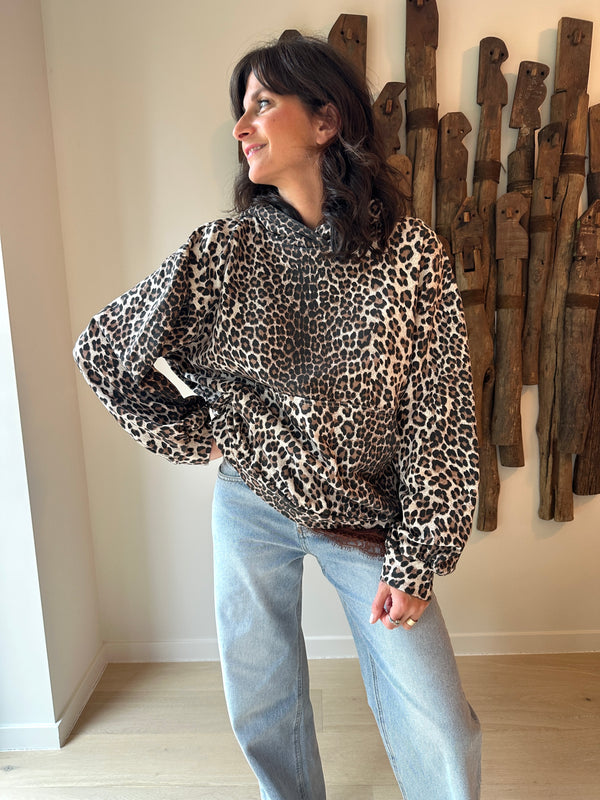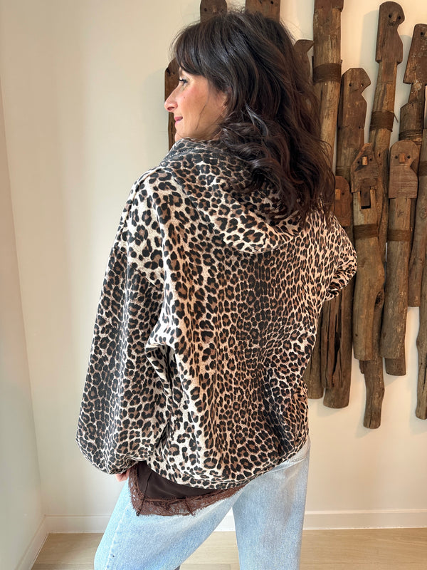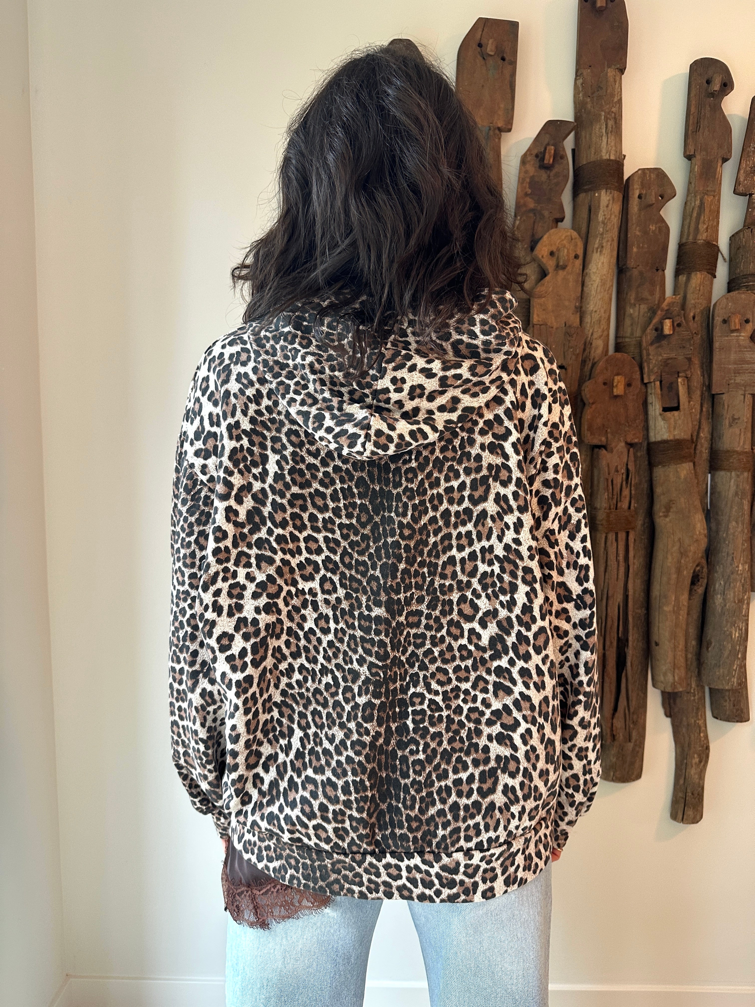 Description : Le léopard devient un basique et sa marie avec toutes vos tenues ! Sweat brun avec capuche et poche kangourou sur le devant. Fabriqué en Italie. Taille unique. Coupe oversize.