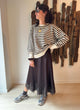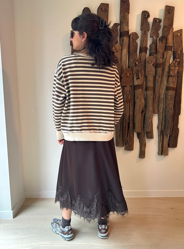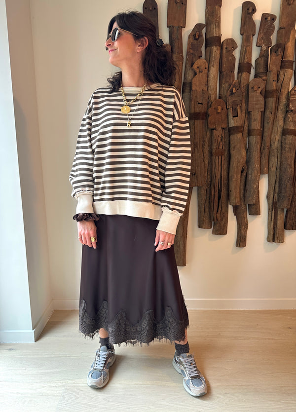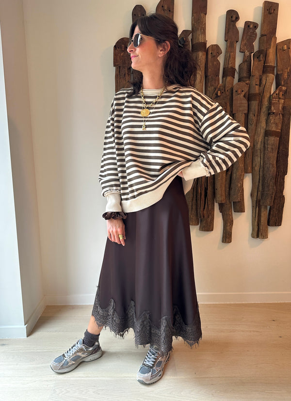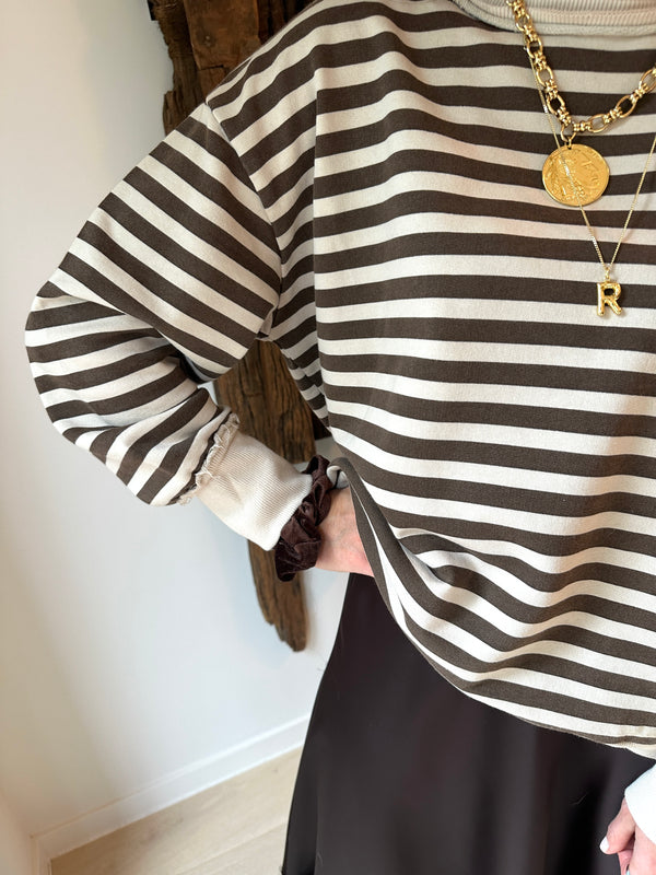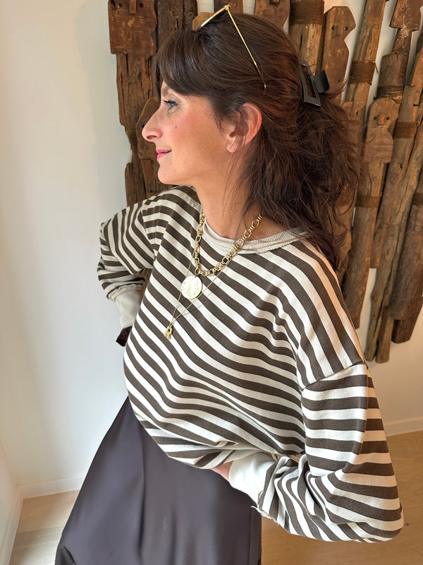 Description : Un basique : le sweat Lirio, imprimé marinière de couleurs beige et marron. Jolis détails aux manches et au col. Fabriqué en Italie. Taille unique. Coupe oversize.
