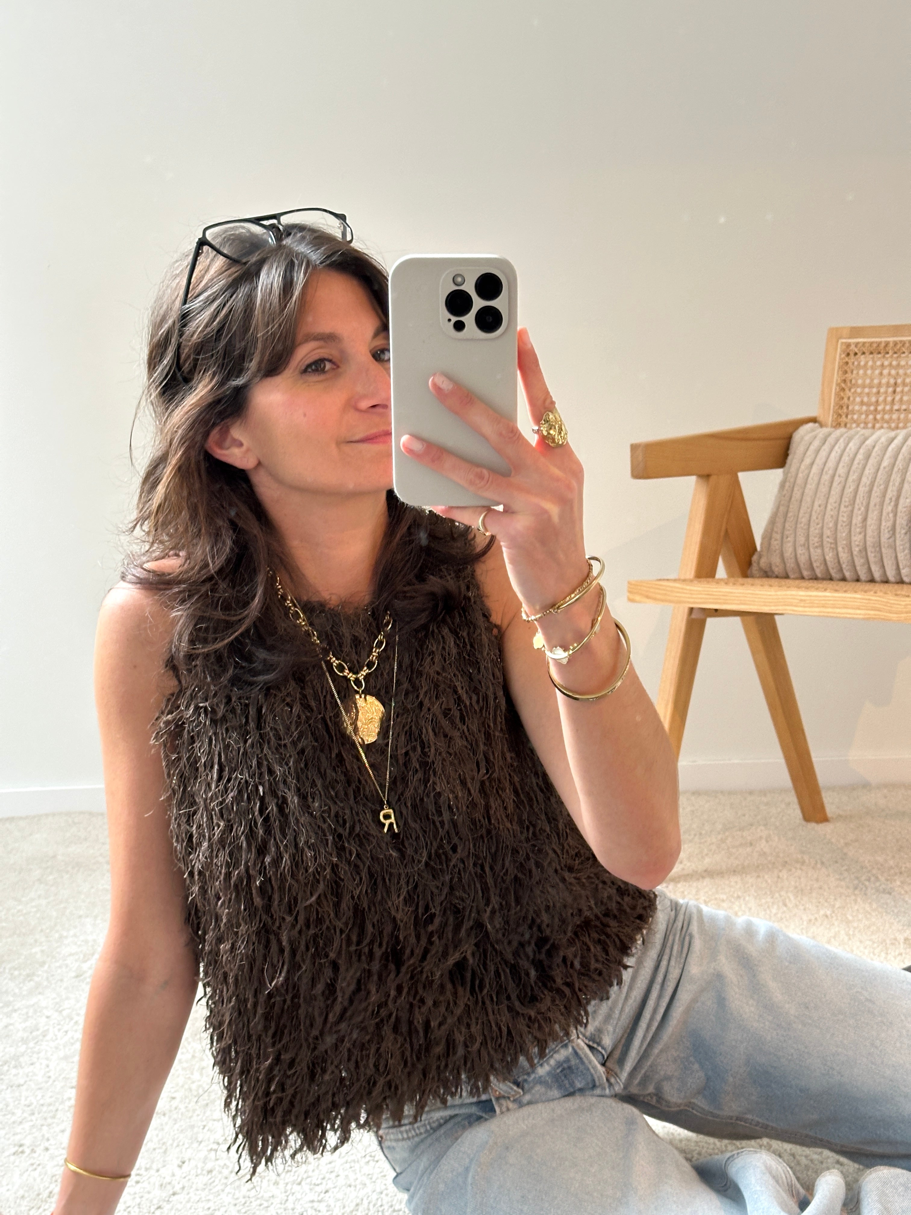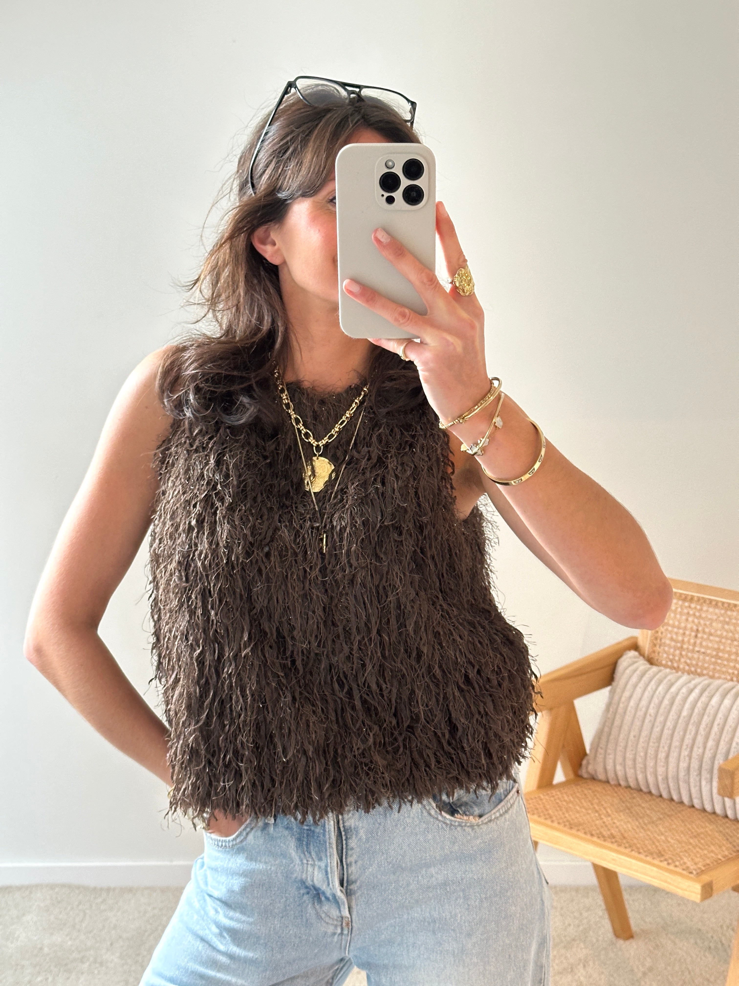 Description : Jolie blouse festive de couleur chocolat avec des minis brillants. Modèle court. Taille unique. Entièrement doublée. Fabriquée en Italie.