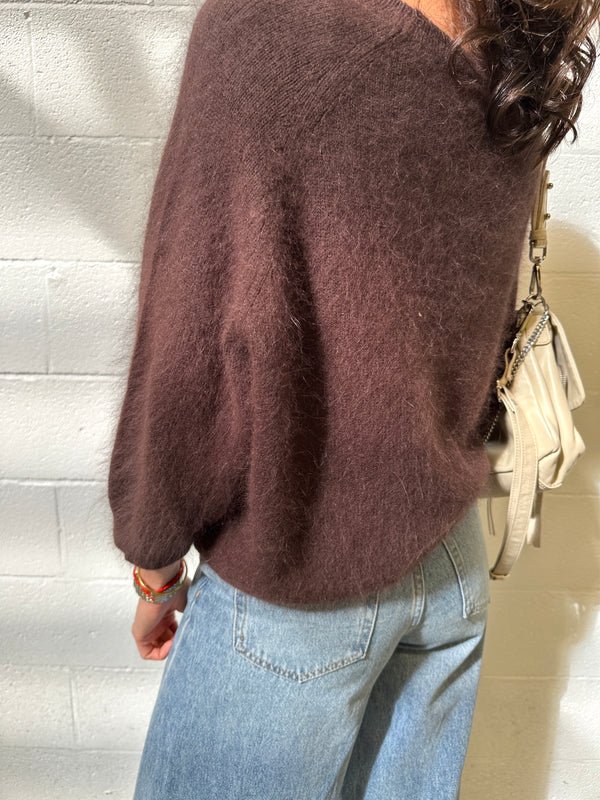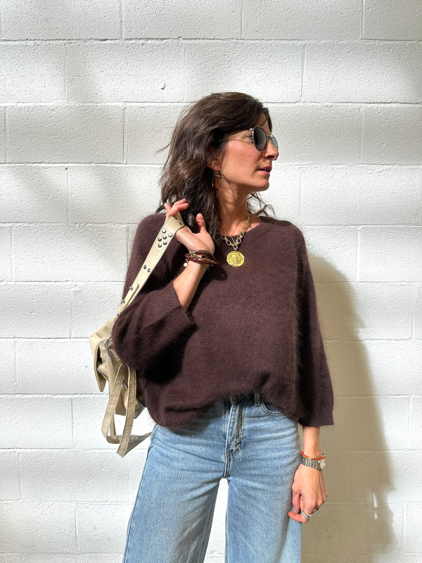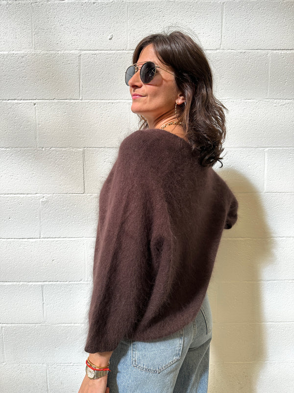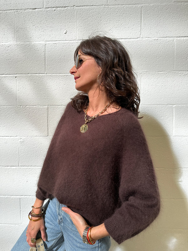 Description : Grand succès de notre event de septembre, la maille en angora Jeyna est ici déclinée dans un marron chaud, couleur phare de cette saison. Hyper douceur (même pour celles qui sont très sensibles). Manches 3/4. Fabriqué en Italie. Taille unique.