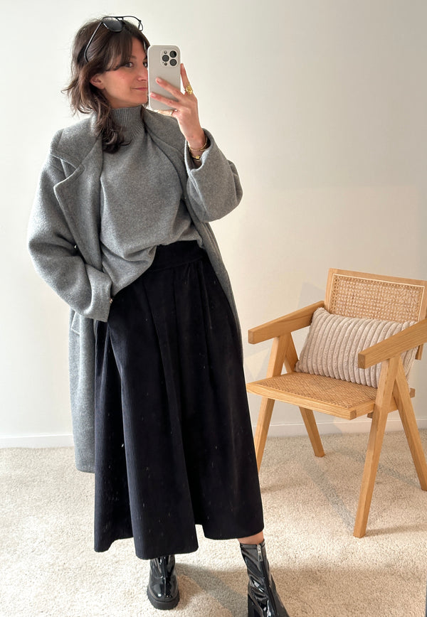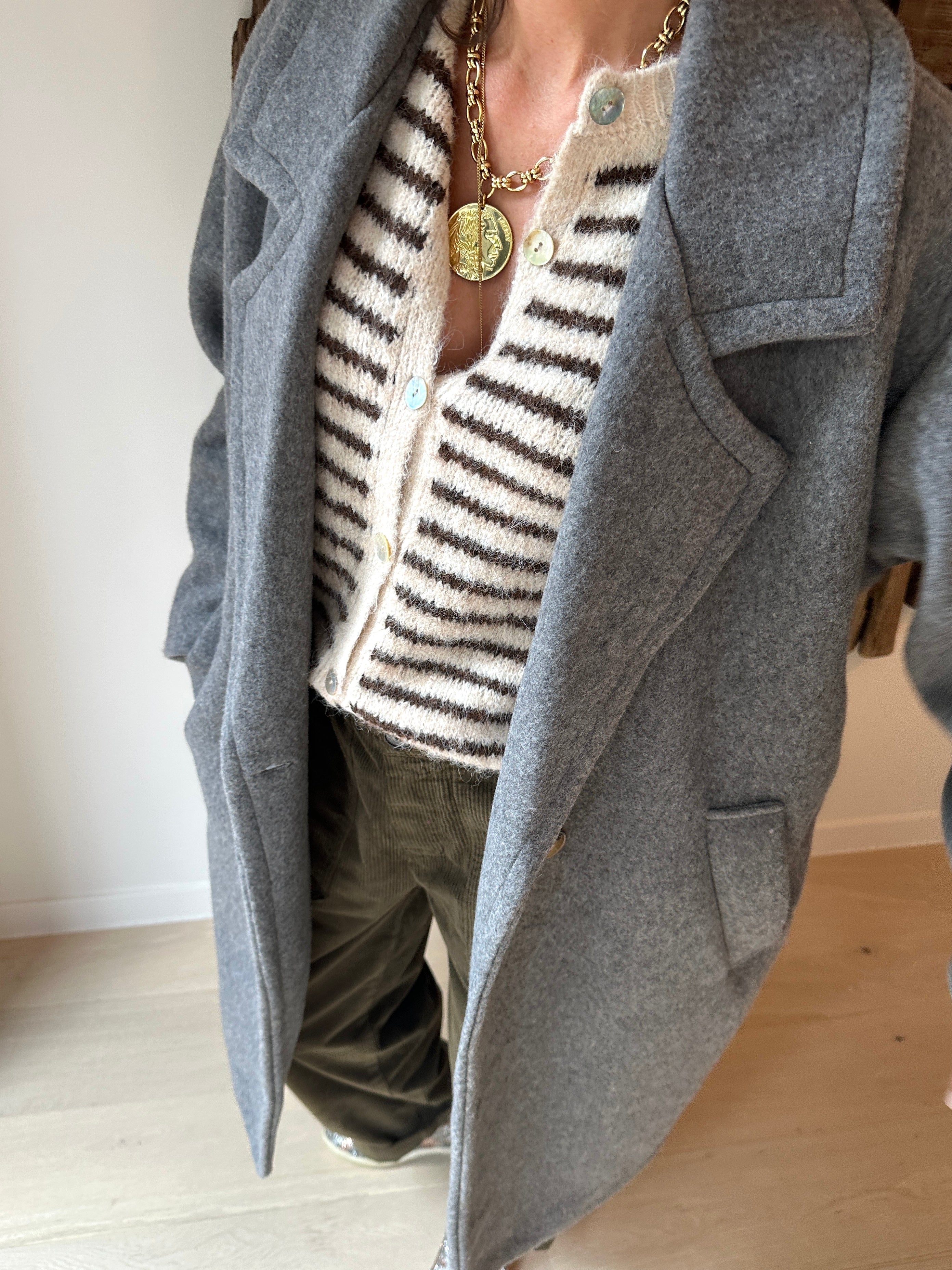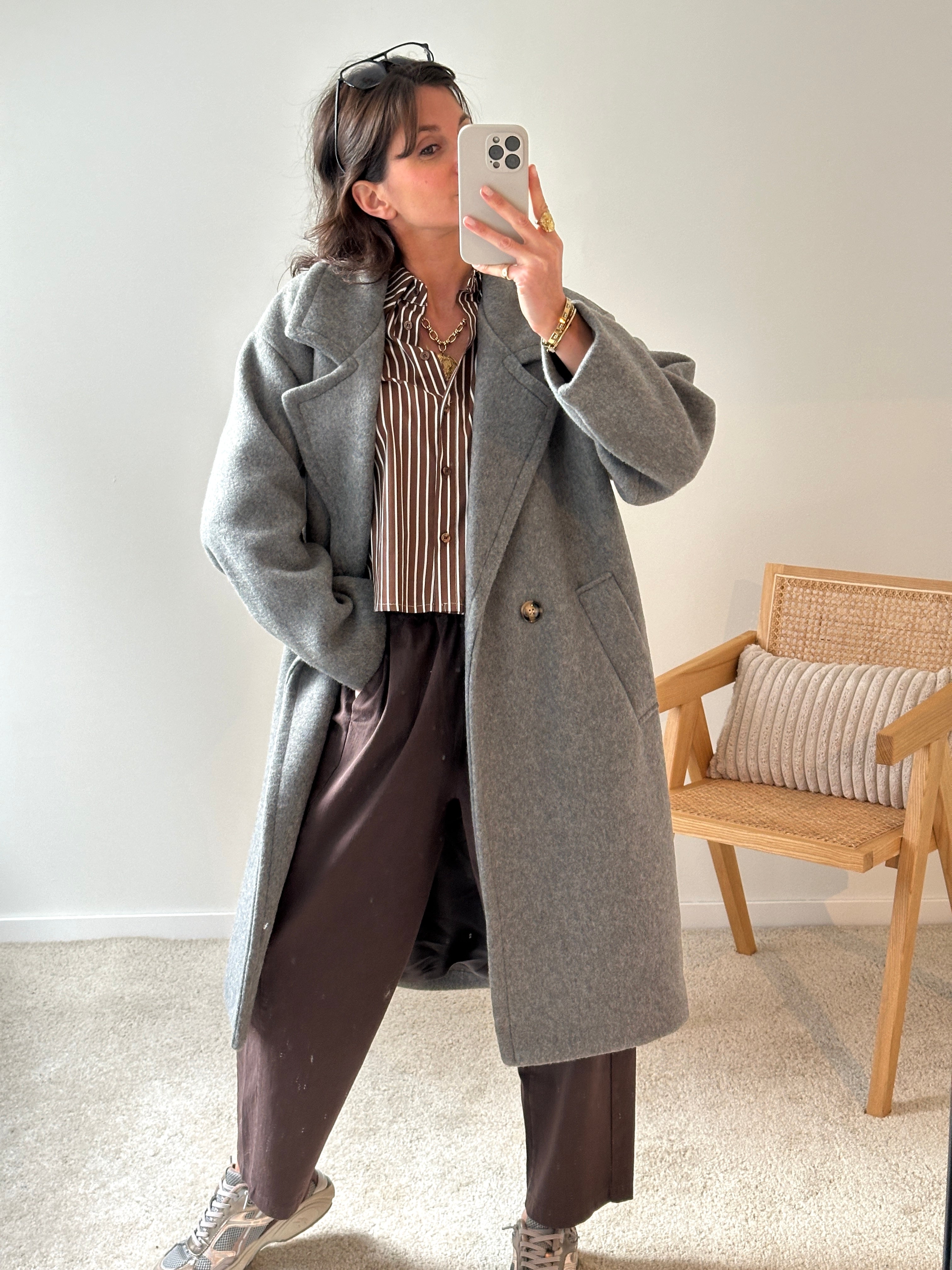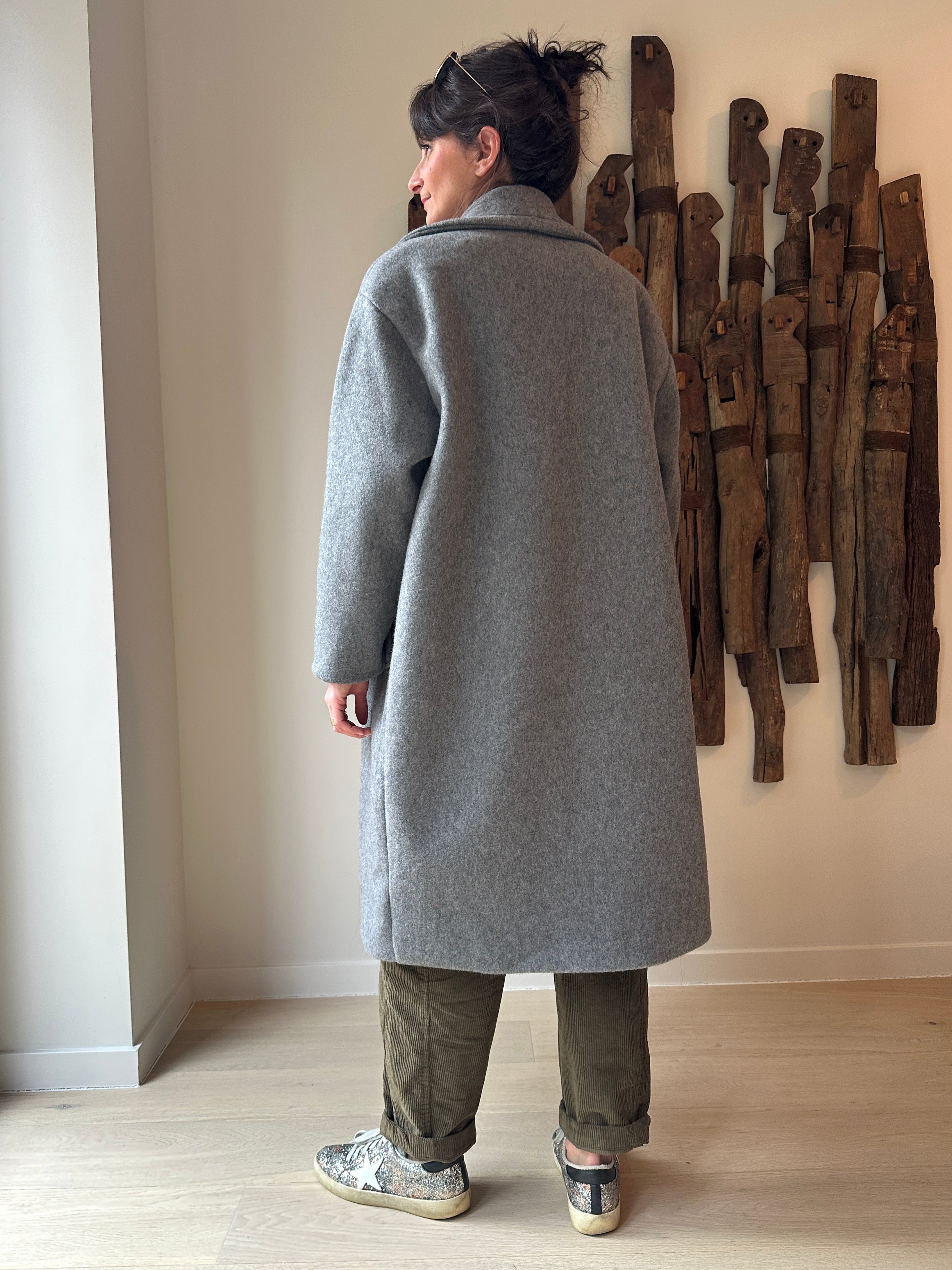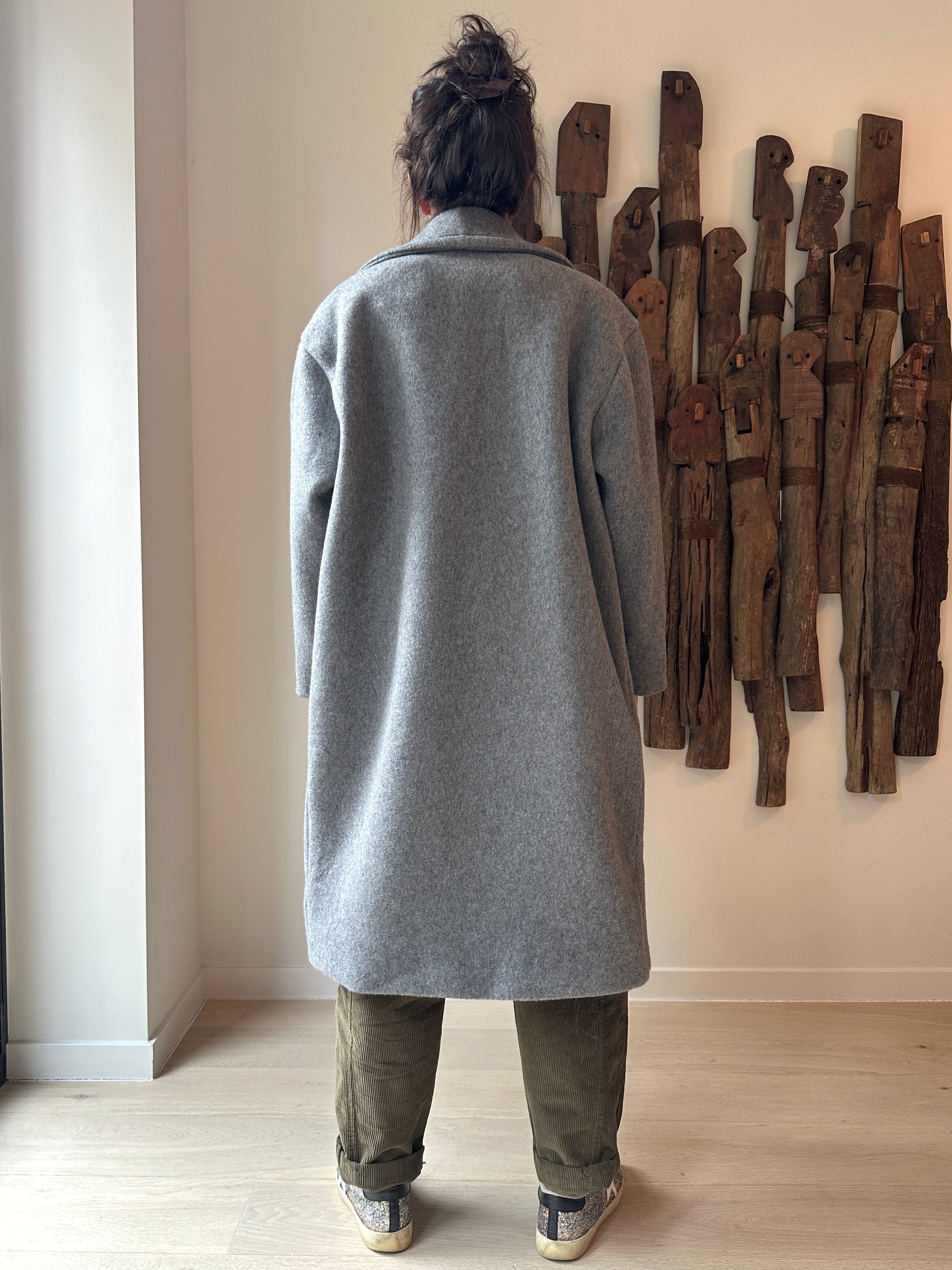 Description : Magnifique manteau chaud de couleur gris. Boutons sur le devant. Poches sur les côtés. Coup de coeur ! Fabriqué en Italie. Taille unique. Coupe oversize.