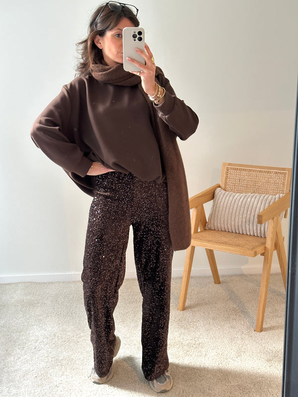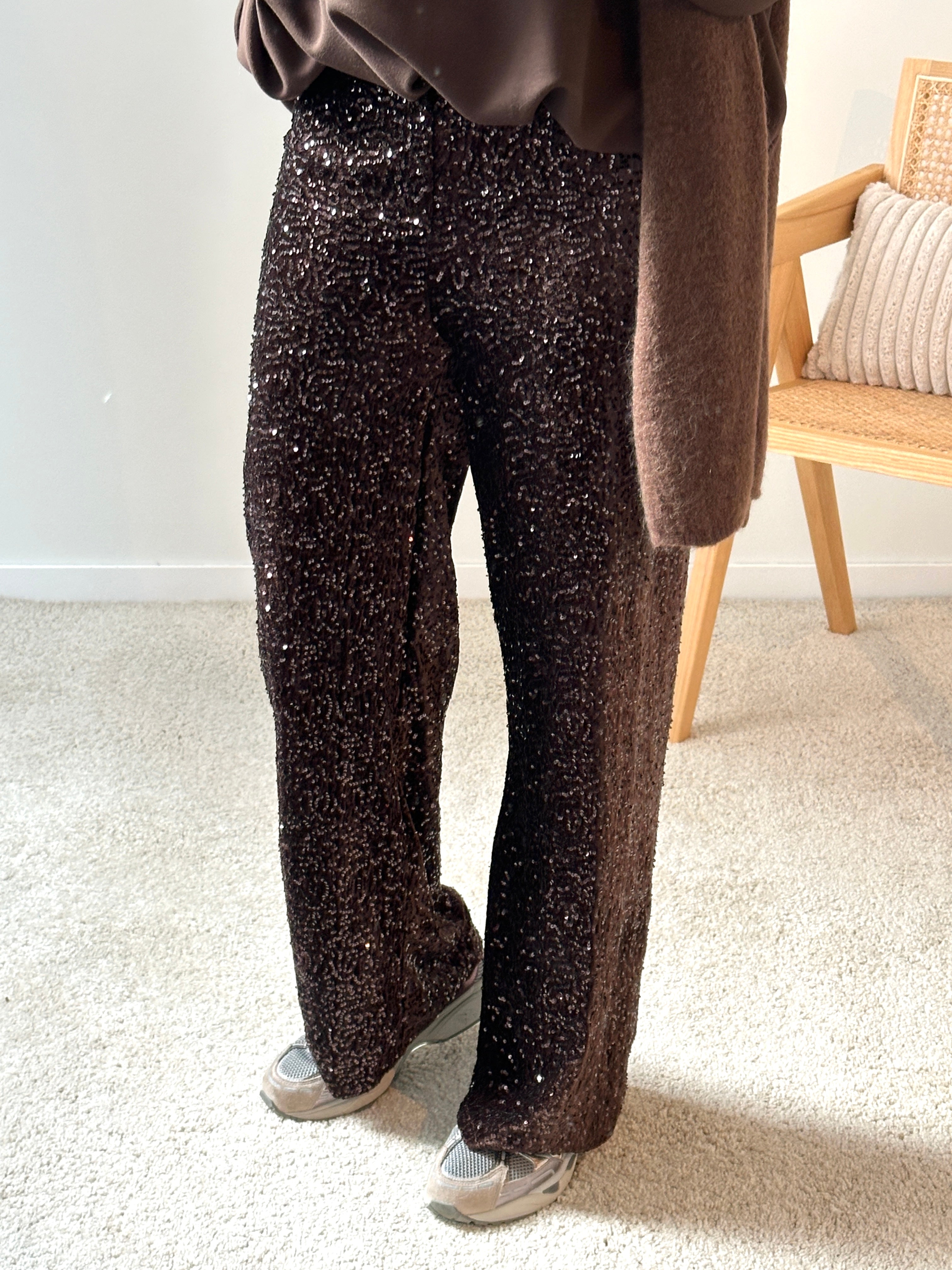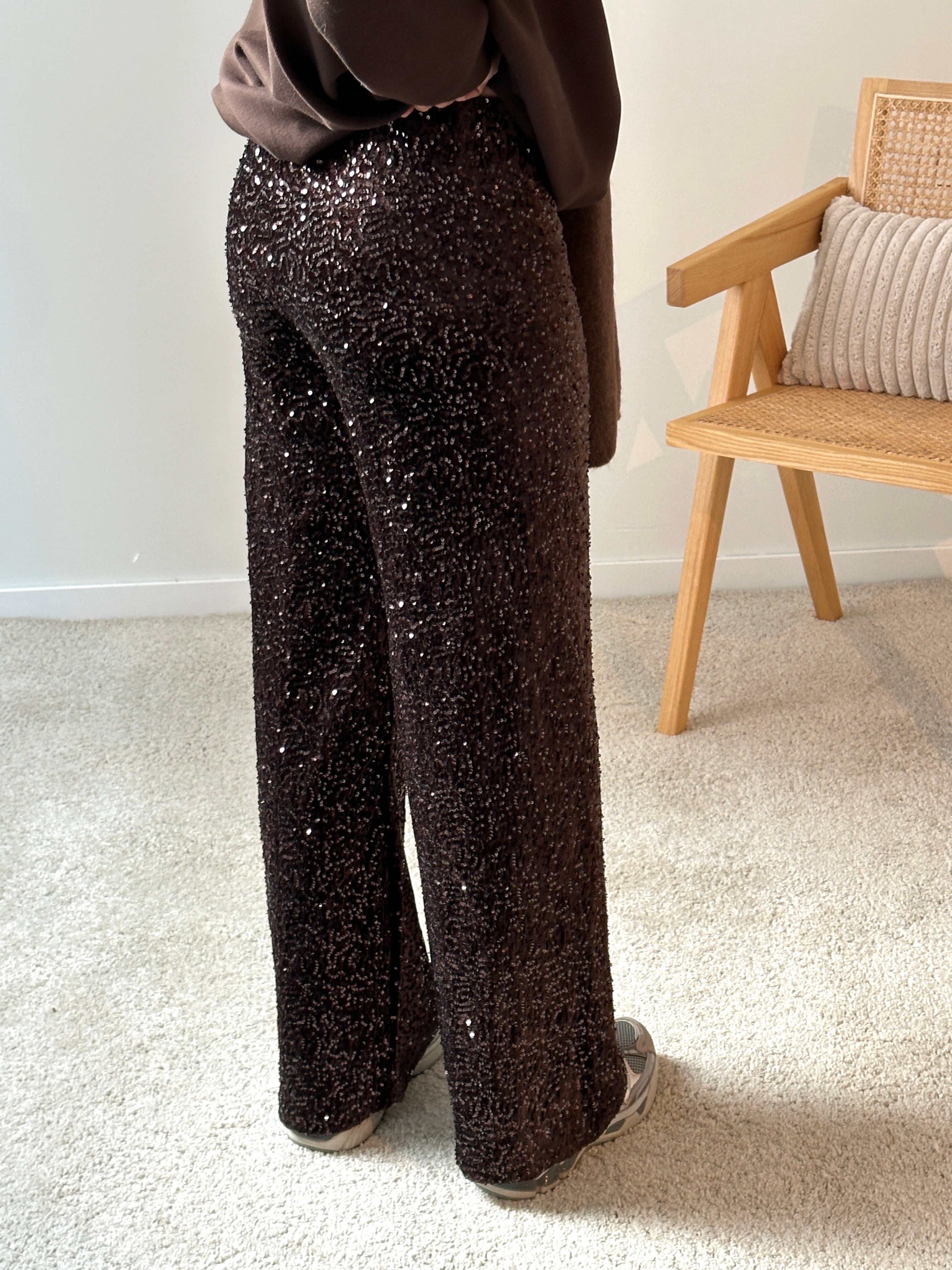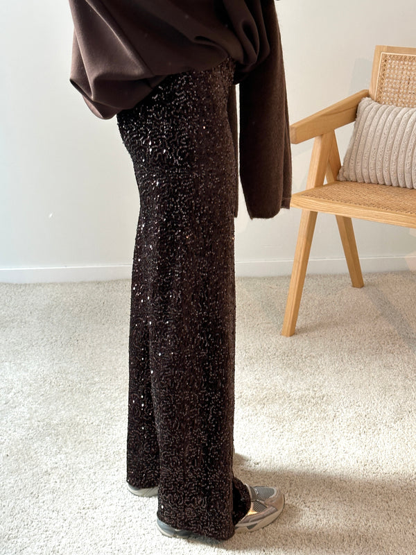 Description : Joli pantalon à sequins de couleur chocolat. Elastique à la taille pour un super confort. Entièrement doublé (ne gratte pas!). Modèle relativement court (ok jusque 1m69) et droit. Taille unique. Fabriqué en Italie.