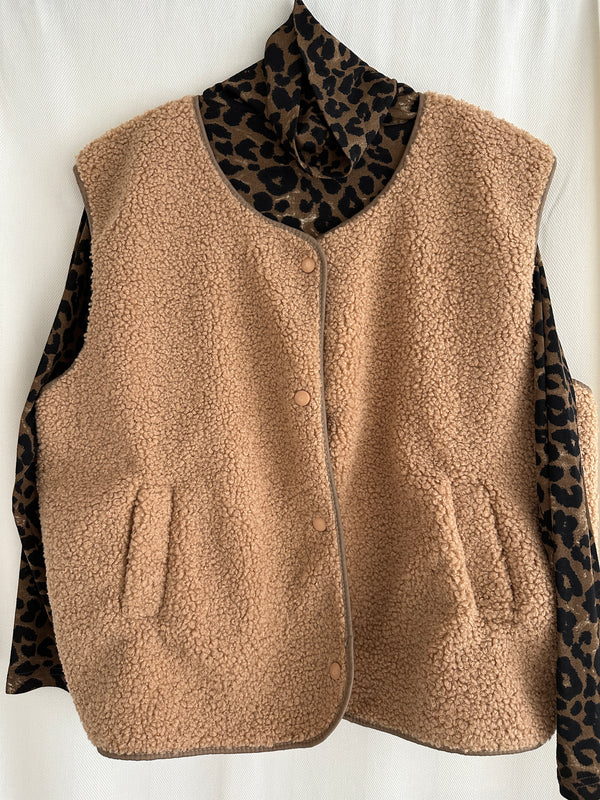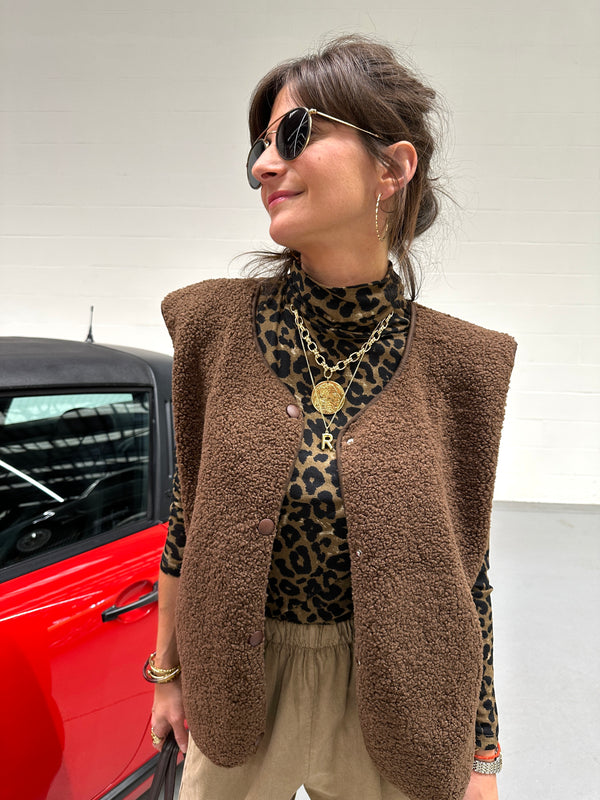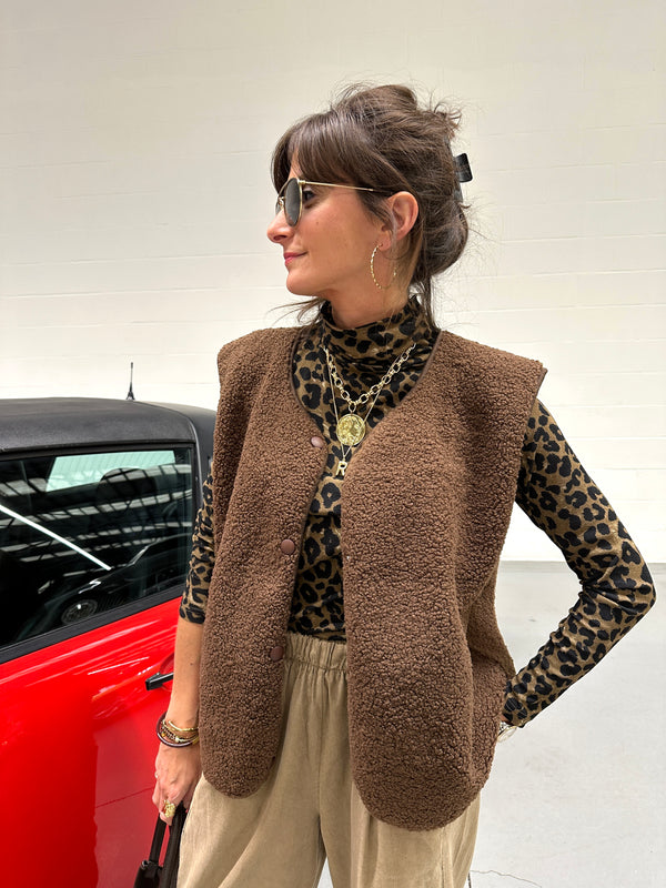Description : A jeter sur n'importe quel sweat, maille ou t-shirt, la veste sans manche Cali réchauffera vos tenues d'automne. Fabriquée en Italie. Taille unique. Coupe oversize. Disponible en camel et en chocolat.