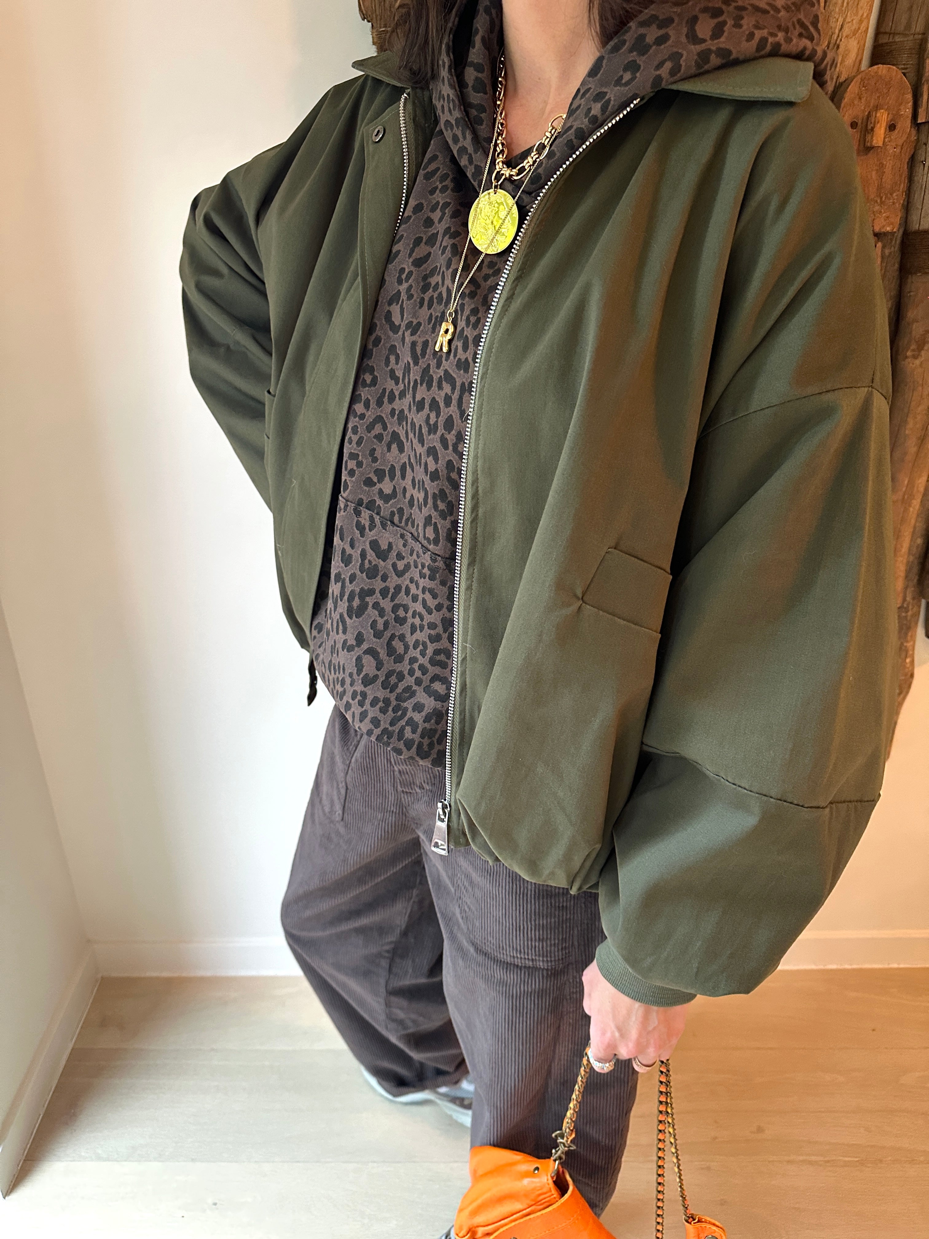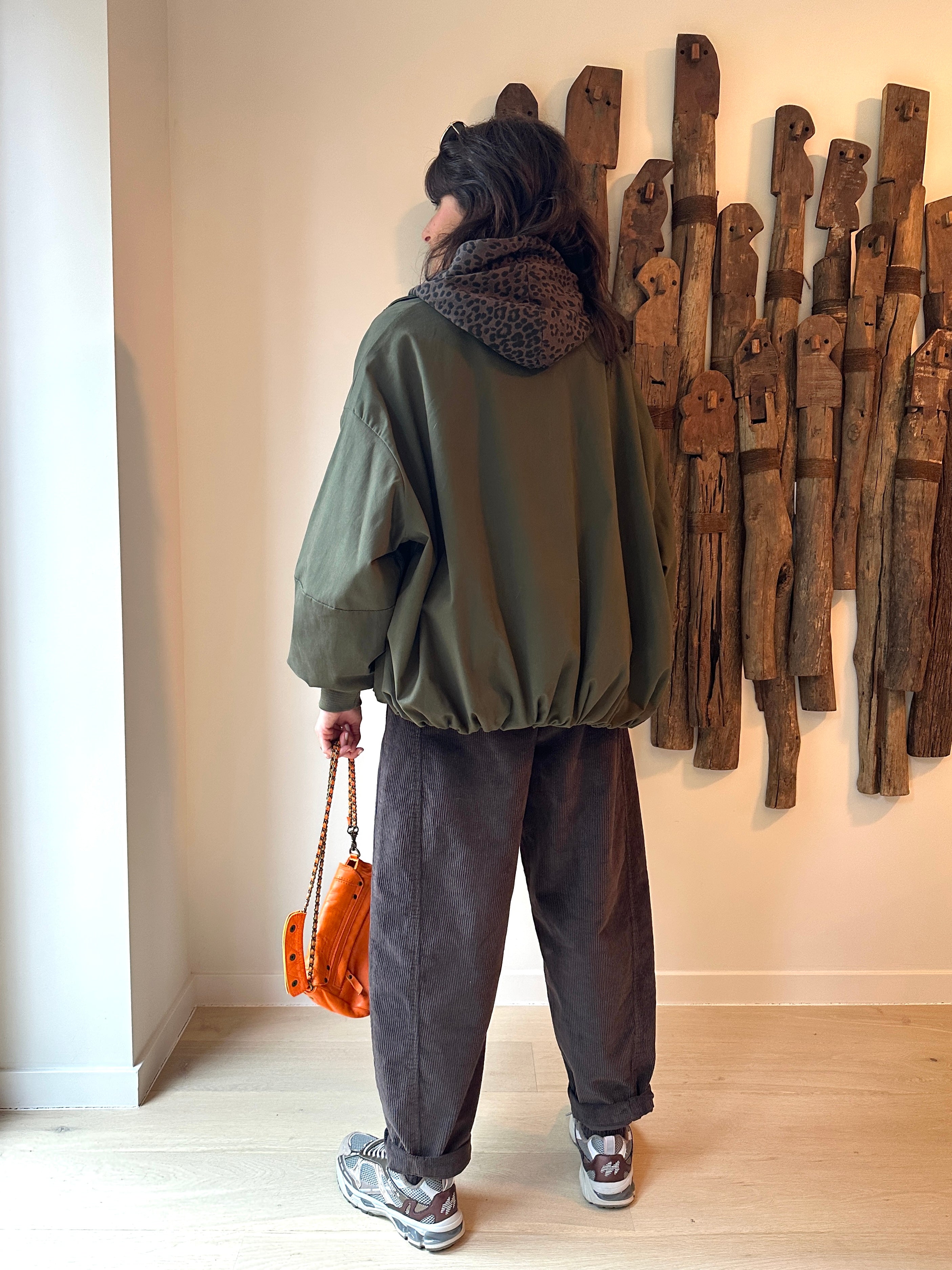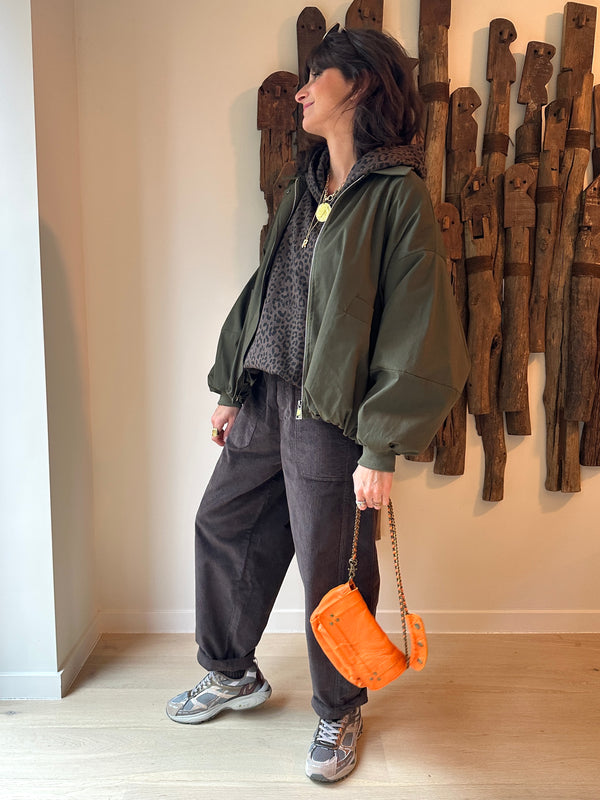 Description : Crush pour ce blouson modèle bomber à la coupe par-faite ! Je l'ai essayé et j'ai directement craqué ! Poches sur les côtés, fermeture éclair à l'avant. Taille unique. Coupe oversize. Manches ballons. Existe en kaki et chocolat foncé. Fabriquée en Italie.