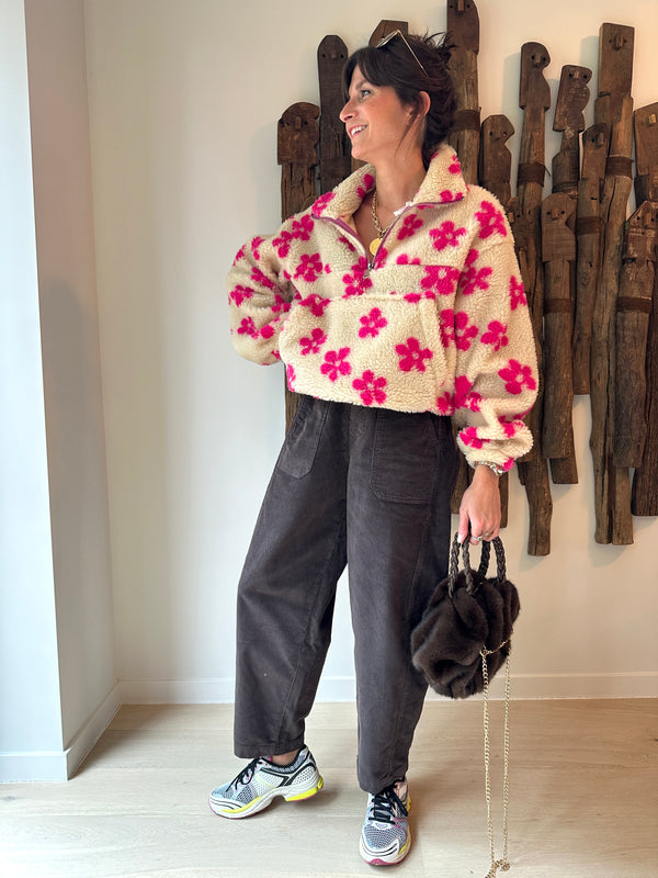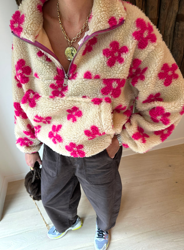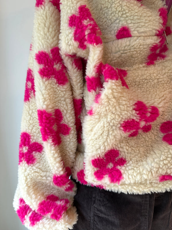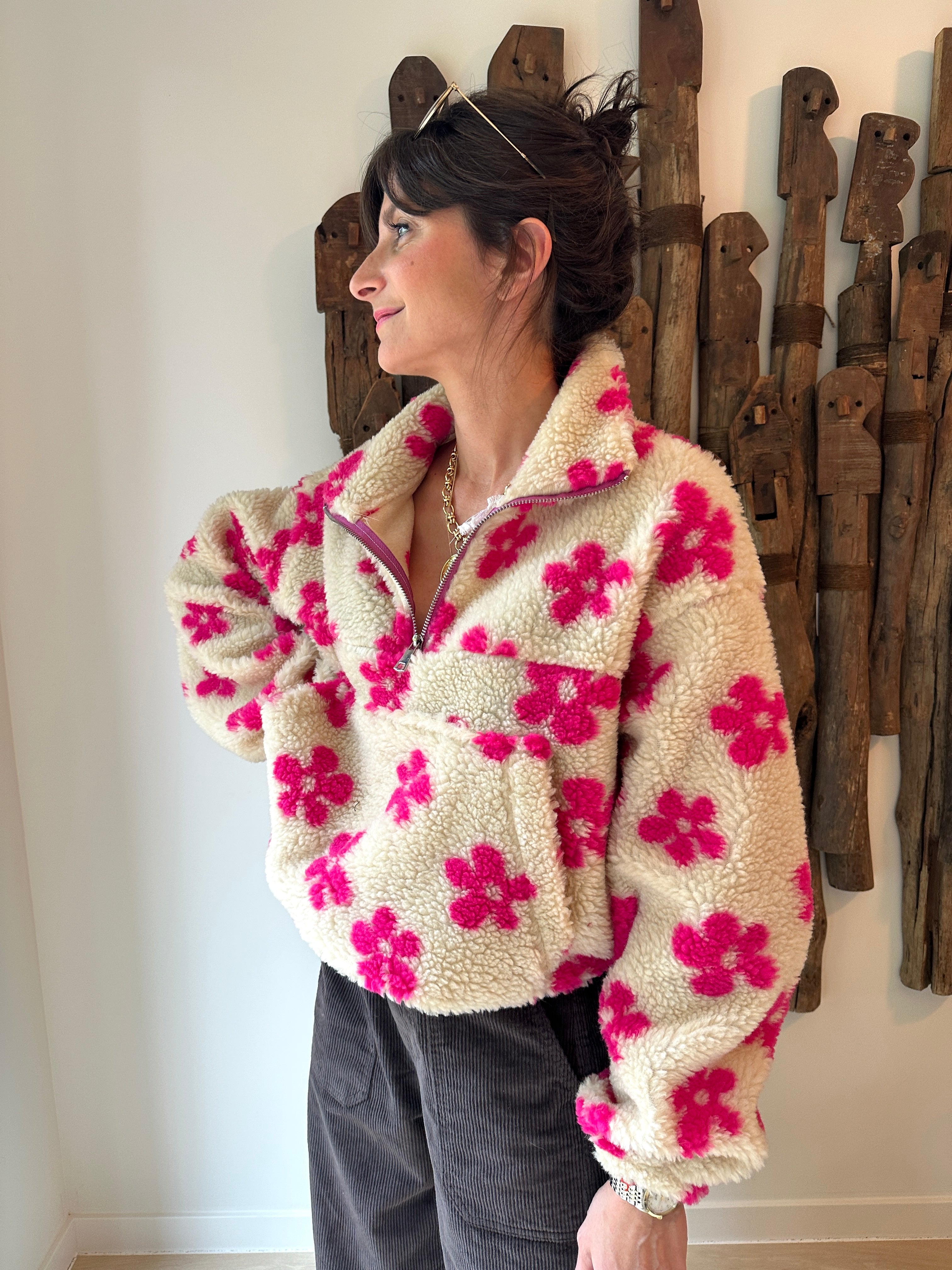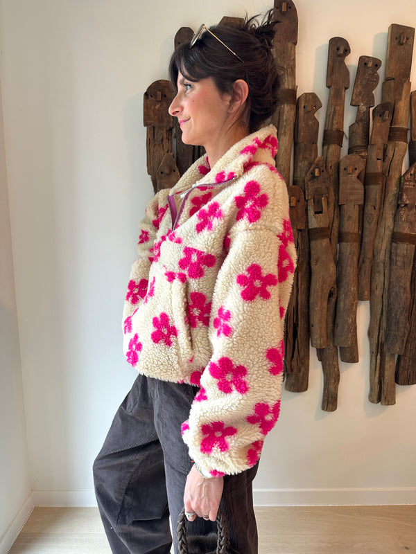 Description : Gros crush pour cette veste en polaire à fleurs beige et fuchsia. Elle donne du peps à notre tenue ! Taille unique. Fermeture éclair. Resserrée à la taille. Fabriquée en Italie.
