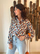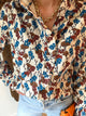 Description : Magnifique chemise au tissu texturé avec imprimé à fleurs de couleurs bleu, beige et bordeaux foncé. Boutons sur le devant et aux manches. Disponible en 3 tailles: S, M et L.