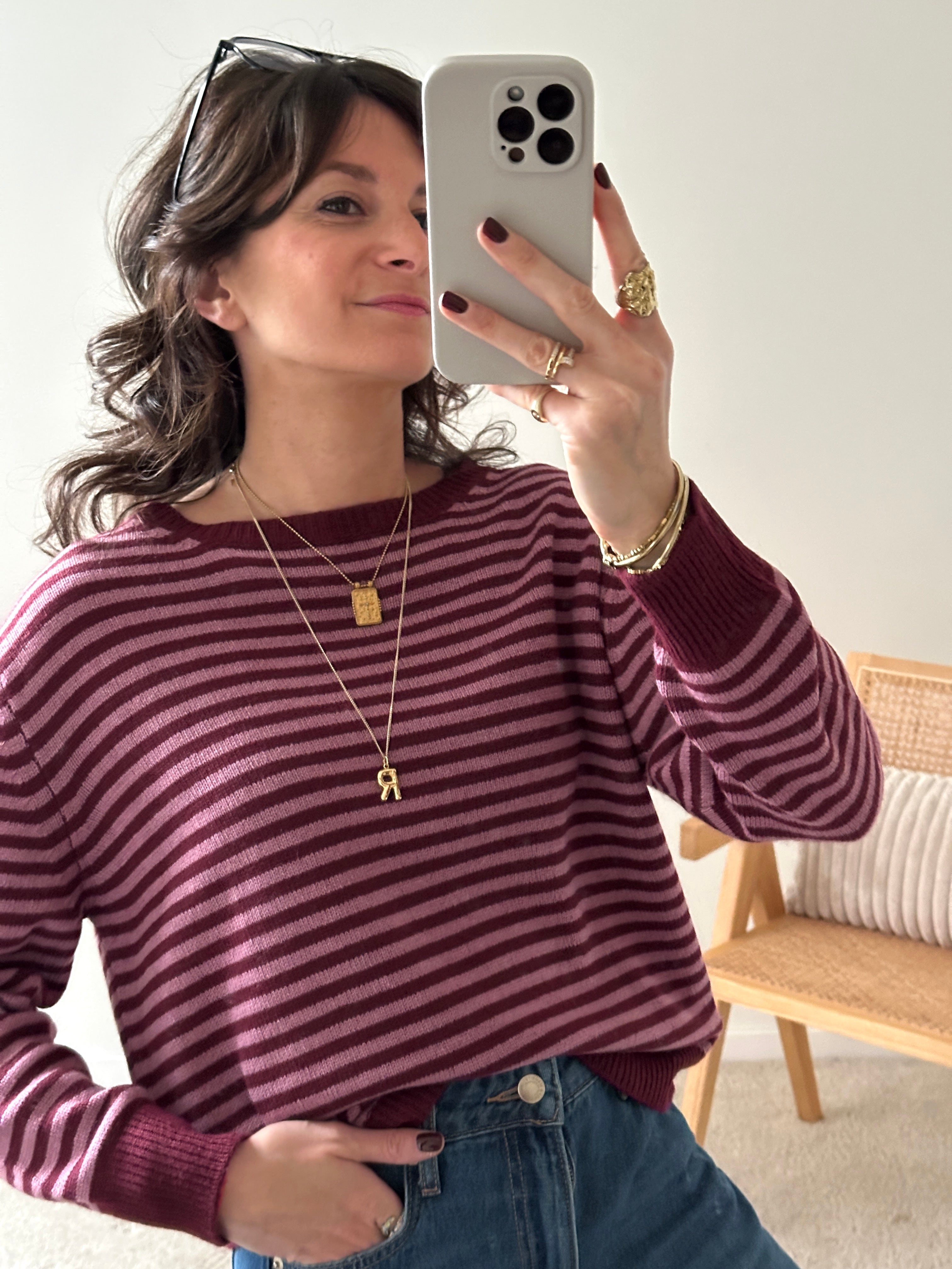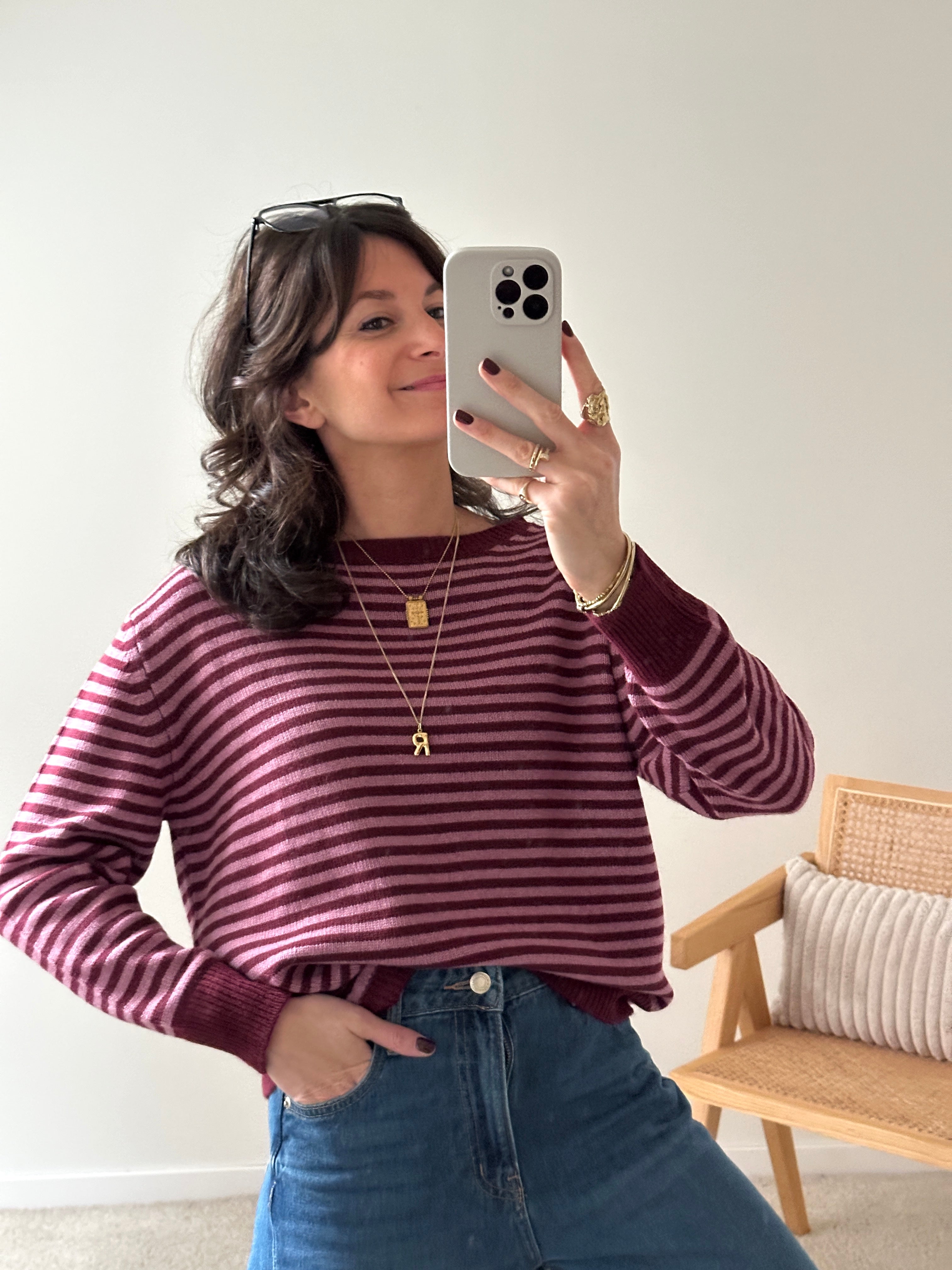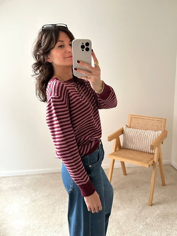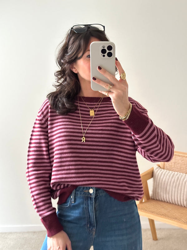 Description : Jolie marinière en maille de couleur bordeaux et rose. Apporte du peps à votre tenue ! Fabriquée en Italie. Taille unique.