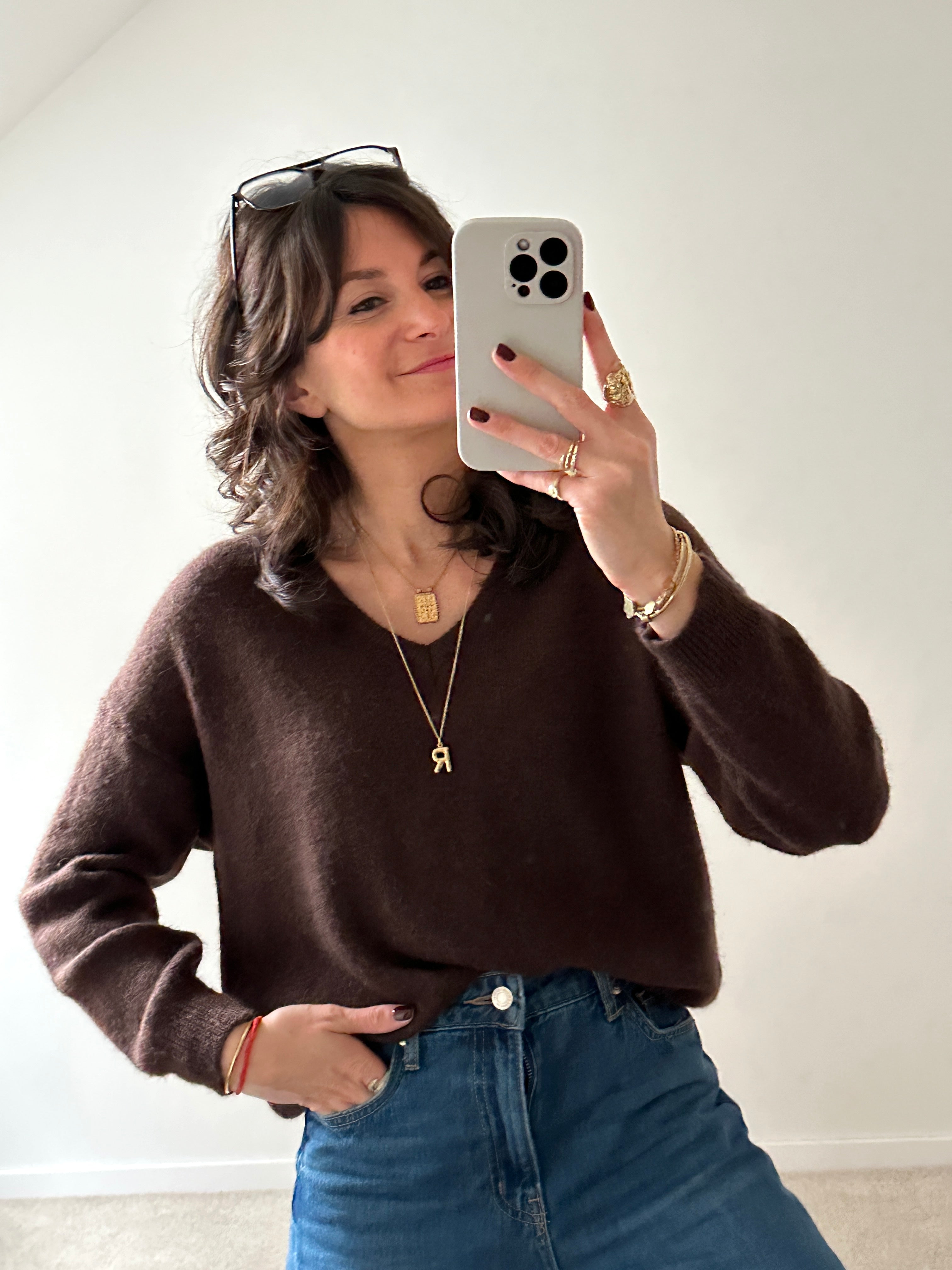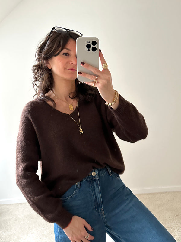 Description : Maille basique avec col V. Un classique à avoir dans sa garde-robe, à porter en toutes circonstances ! Fabriquée en Italie. Taille unique. Disponible en 3 couleurs : écru, marron et bordeaux.
