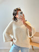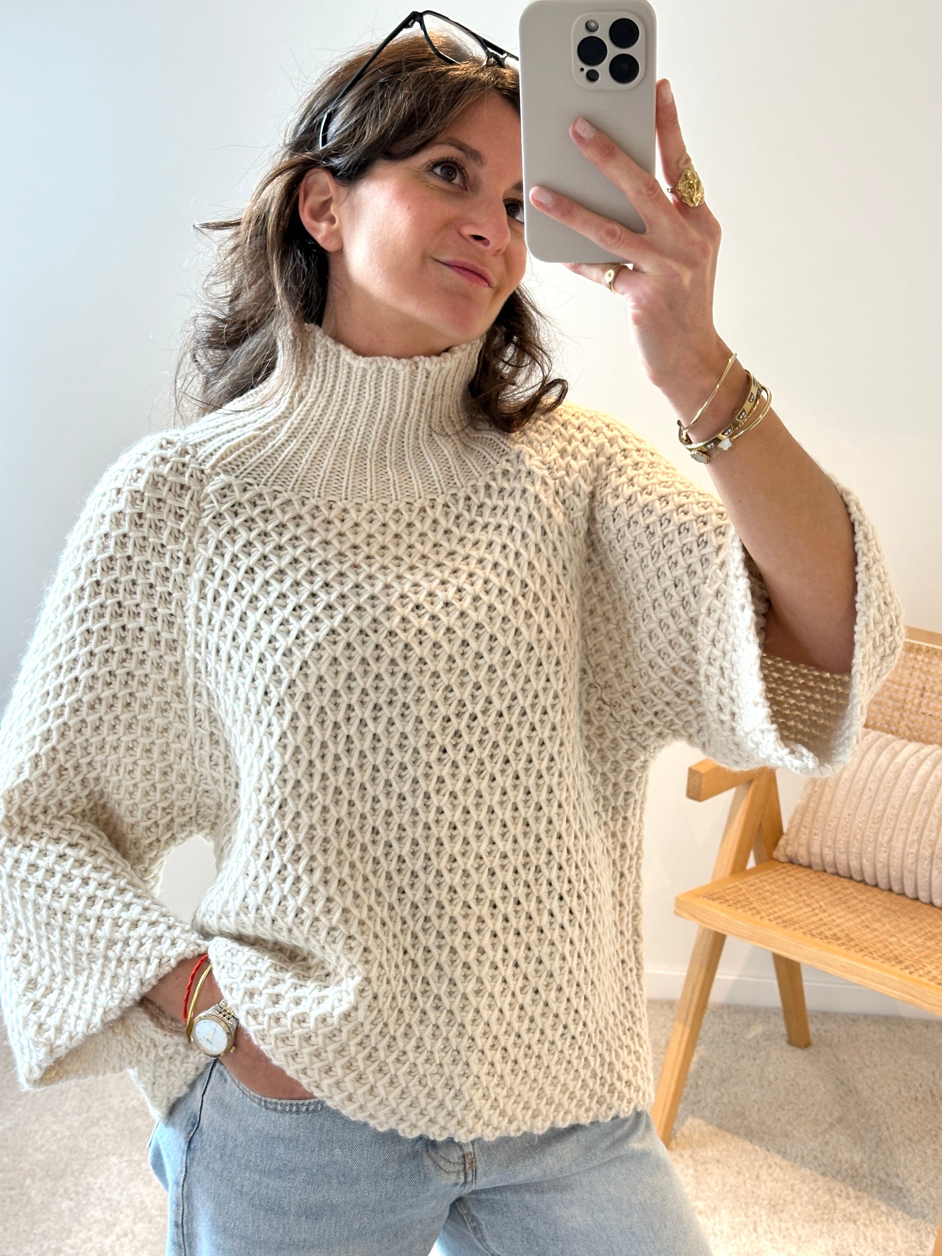 Description : Fan de cette maille avec son lainage effet cable et son col montant. Manche 7/8ème. Coupe oversize, taille unique. Fabriquée en Italie.