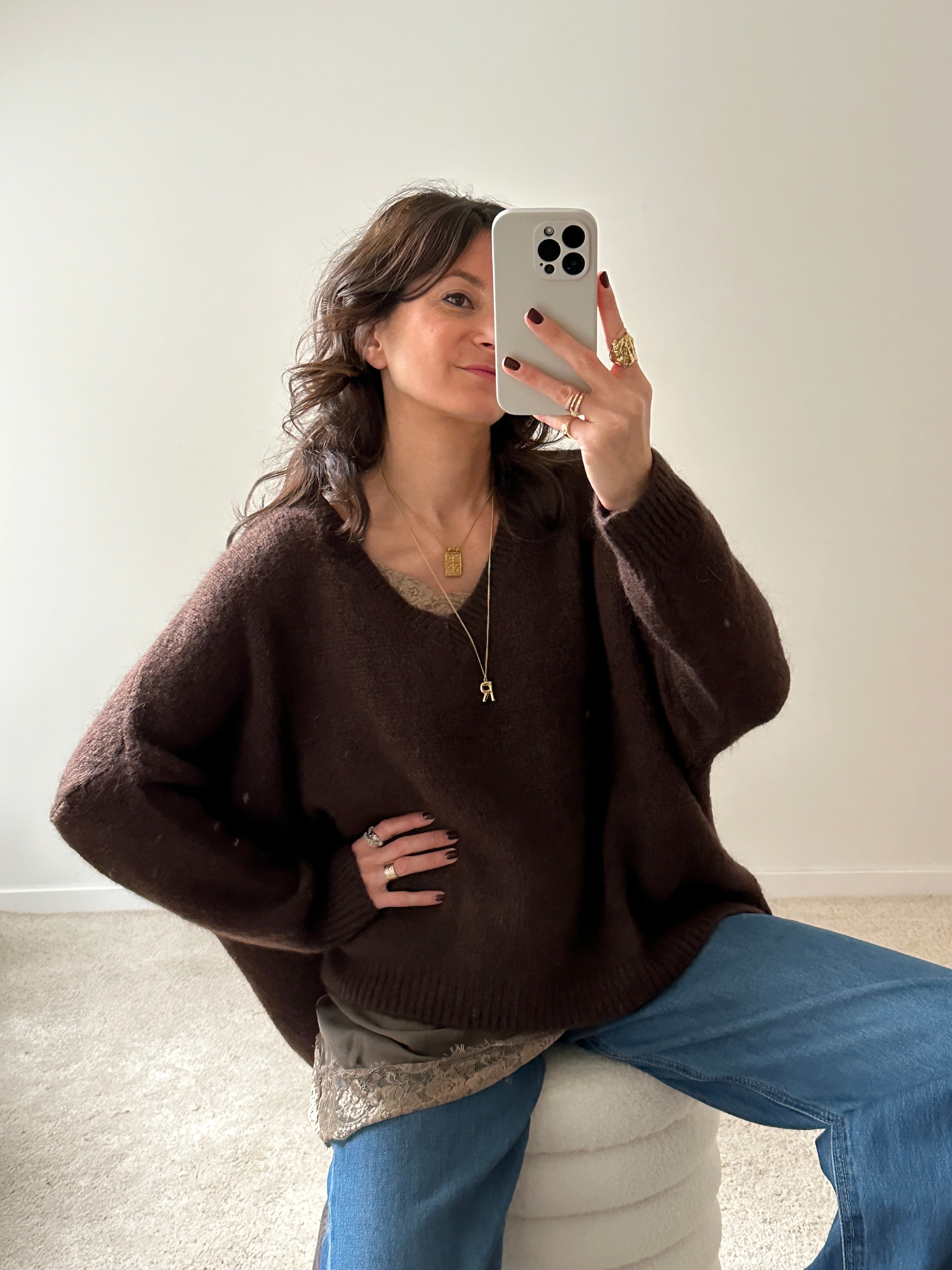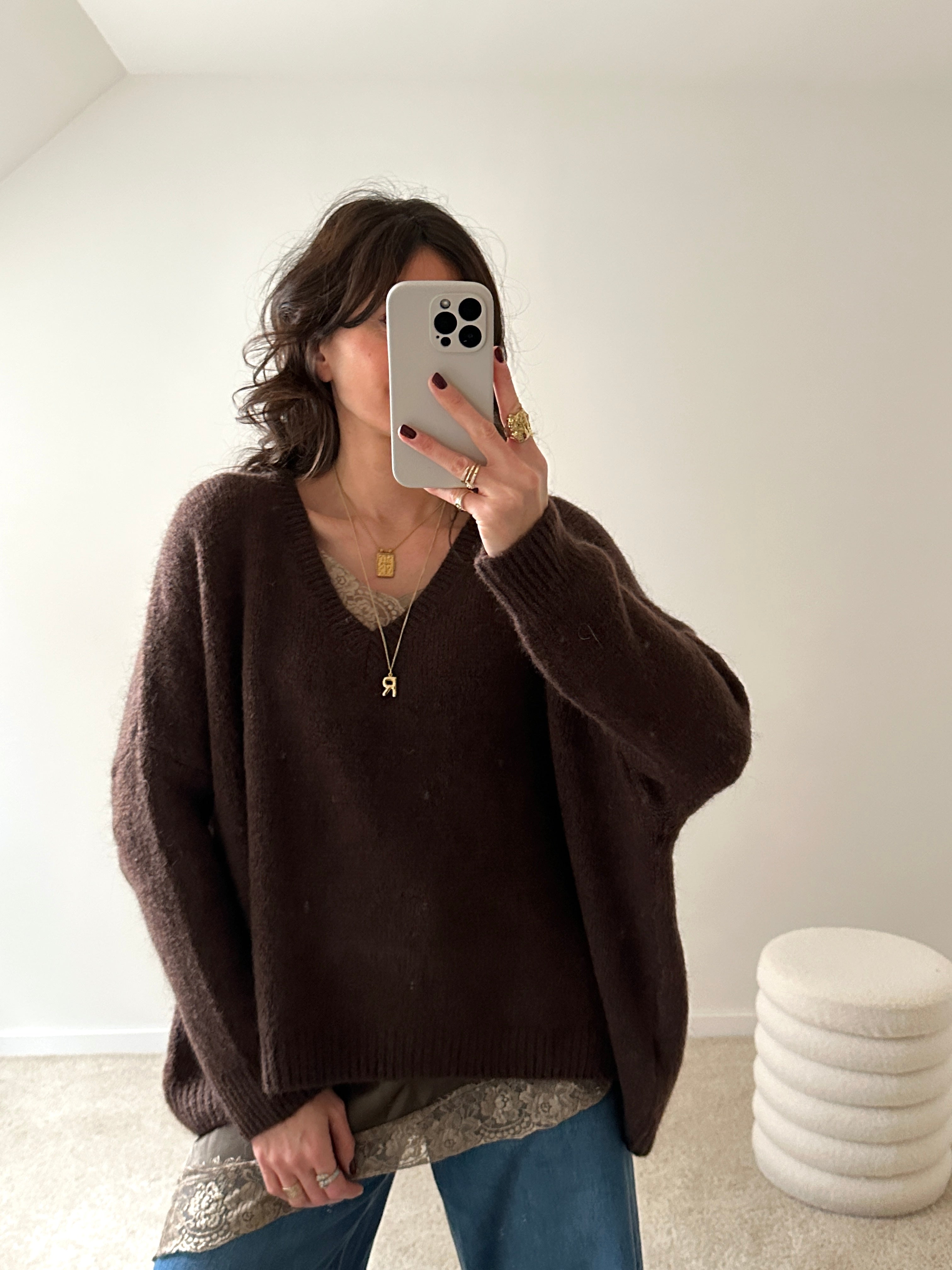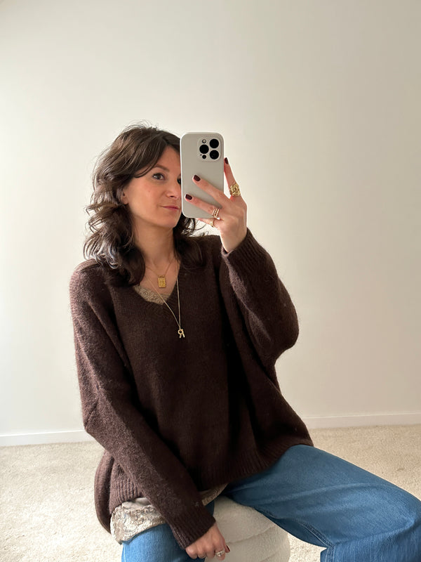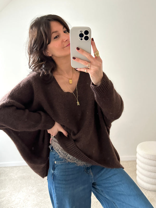 Description : Jolie maille oversize de couleur marron, magnifique portée avec le débardeur Hazel taupe, visible dans le décolleté et dans le bas ! Fabriquée en Italie. Coupe très oversize, taille unique.