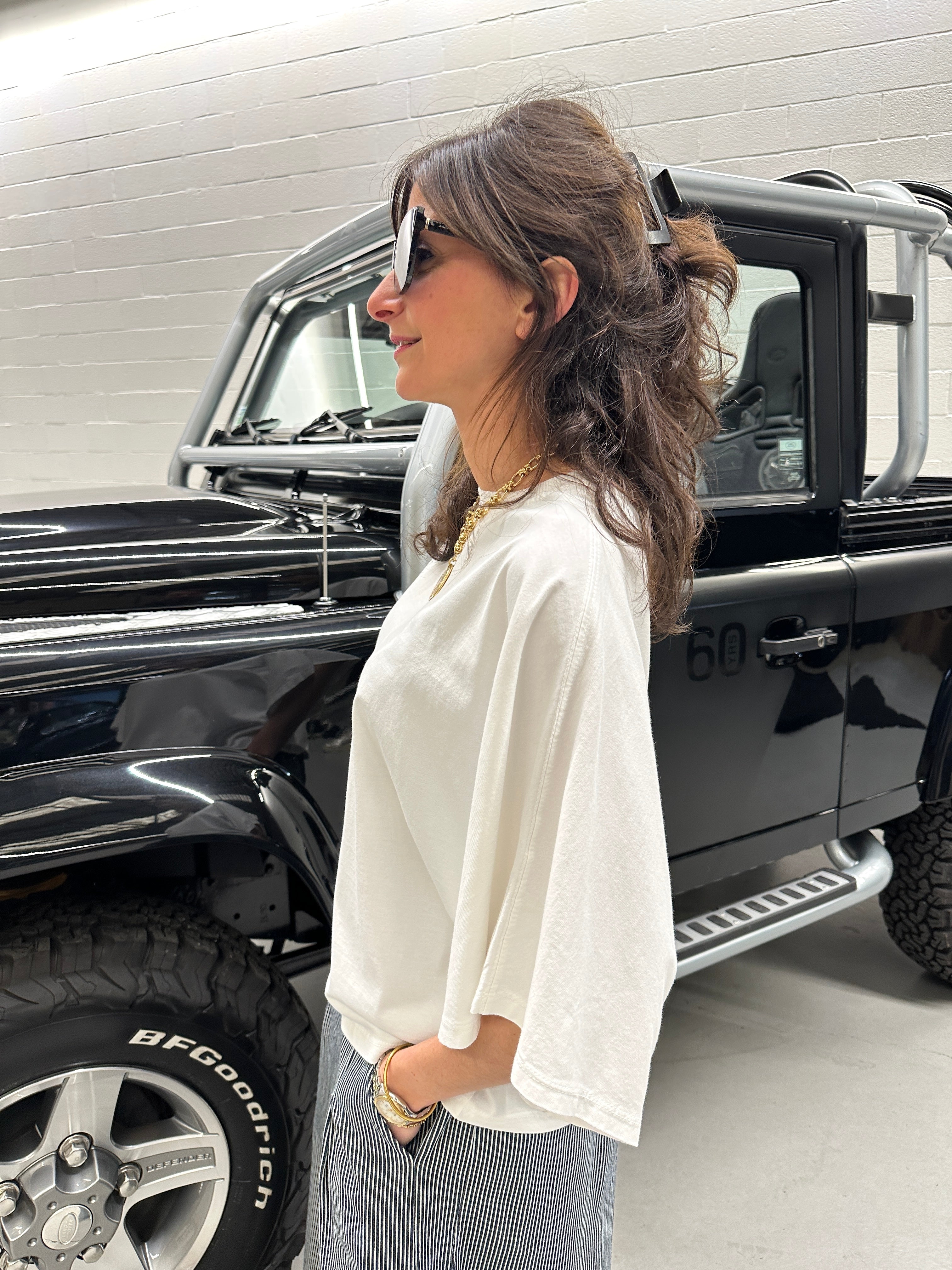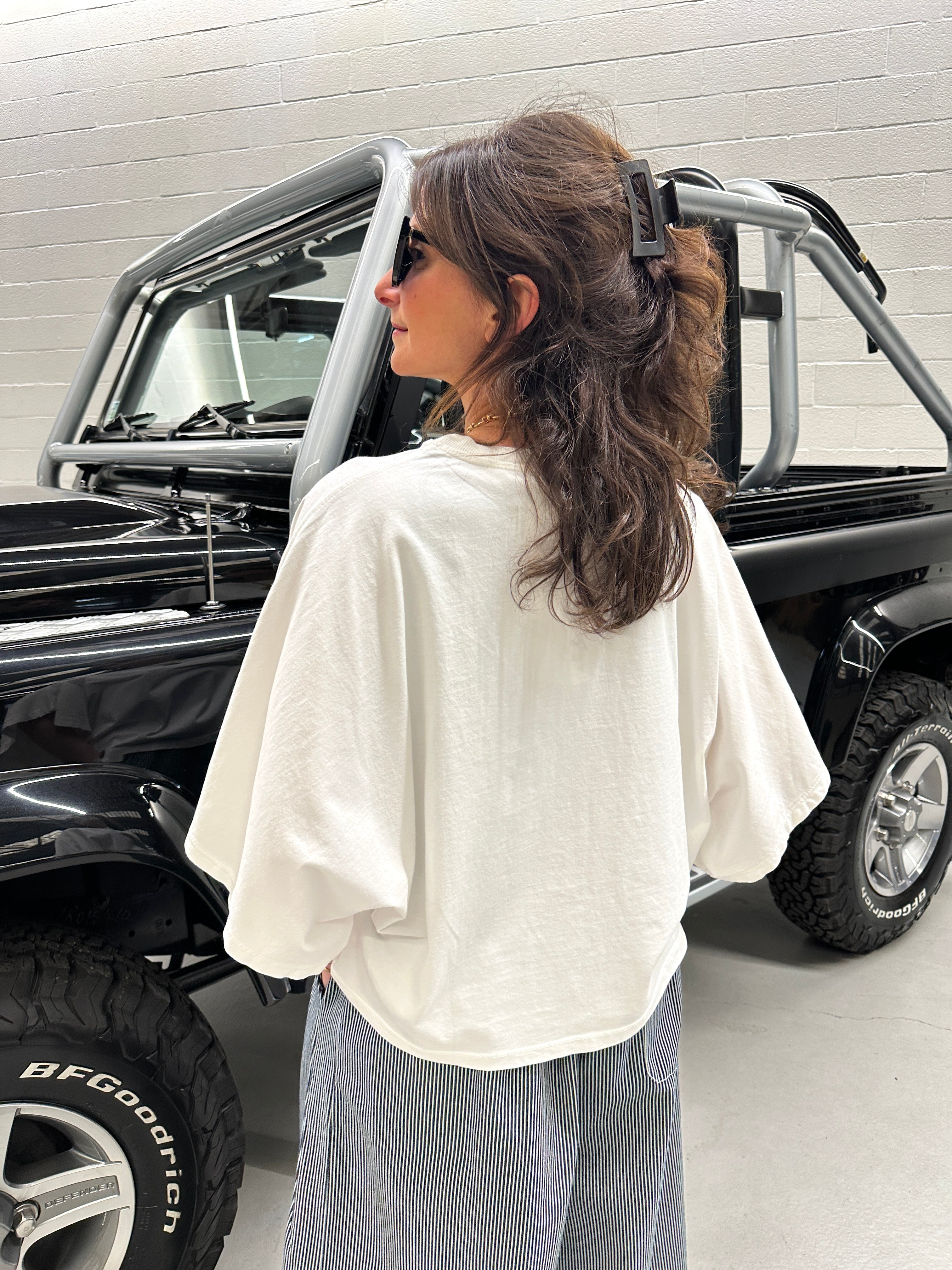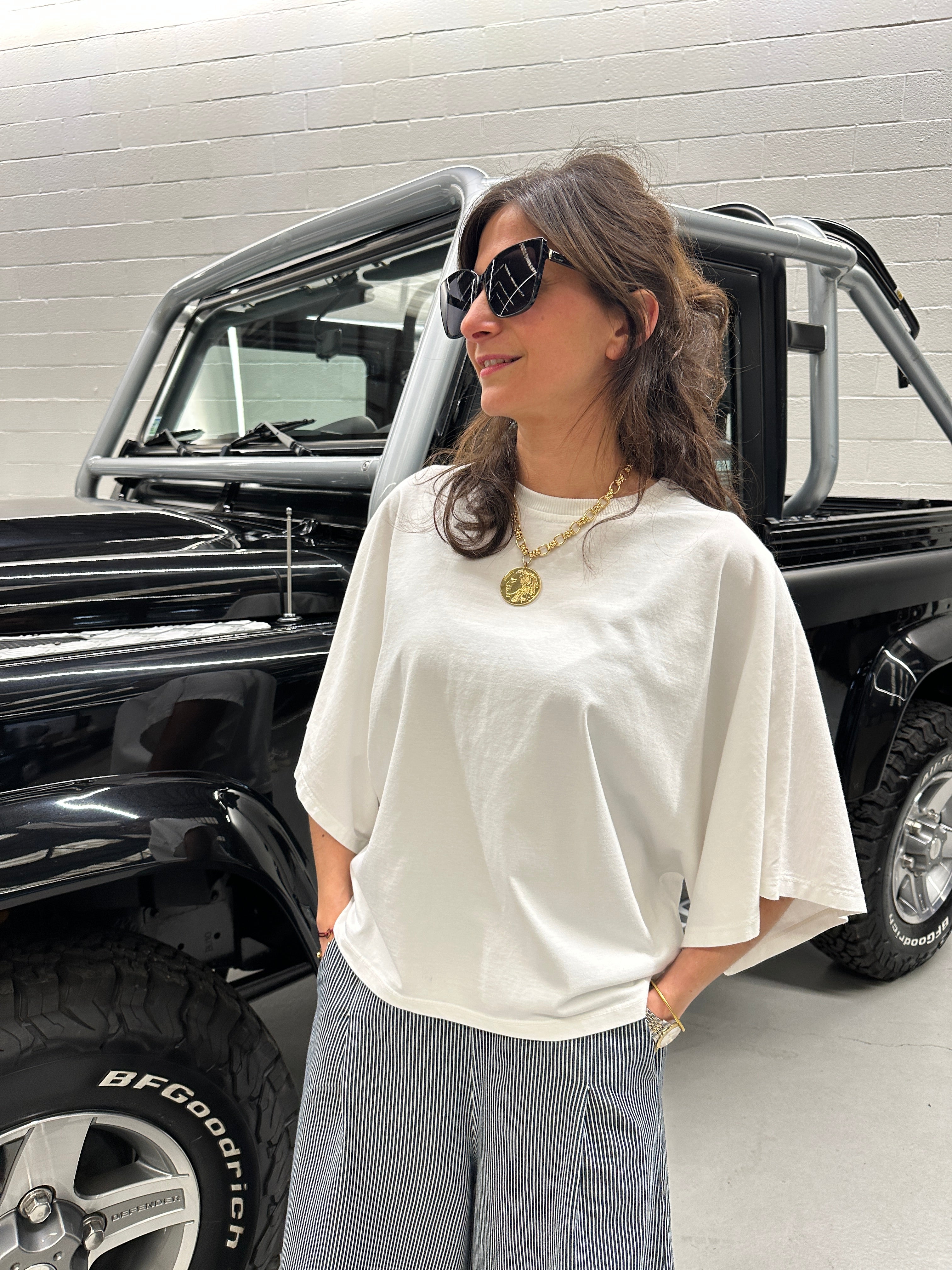 Description : T-shirt basique blanc en coton avec col texturé et manches larges. Fabriqué en Italie, taille unique, modèle oversize.