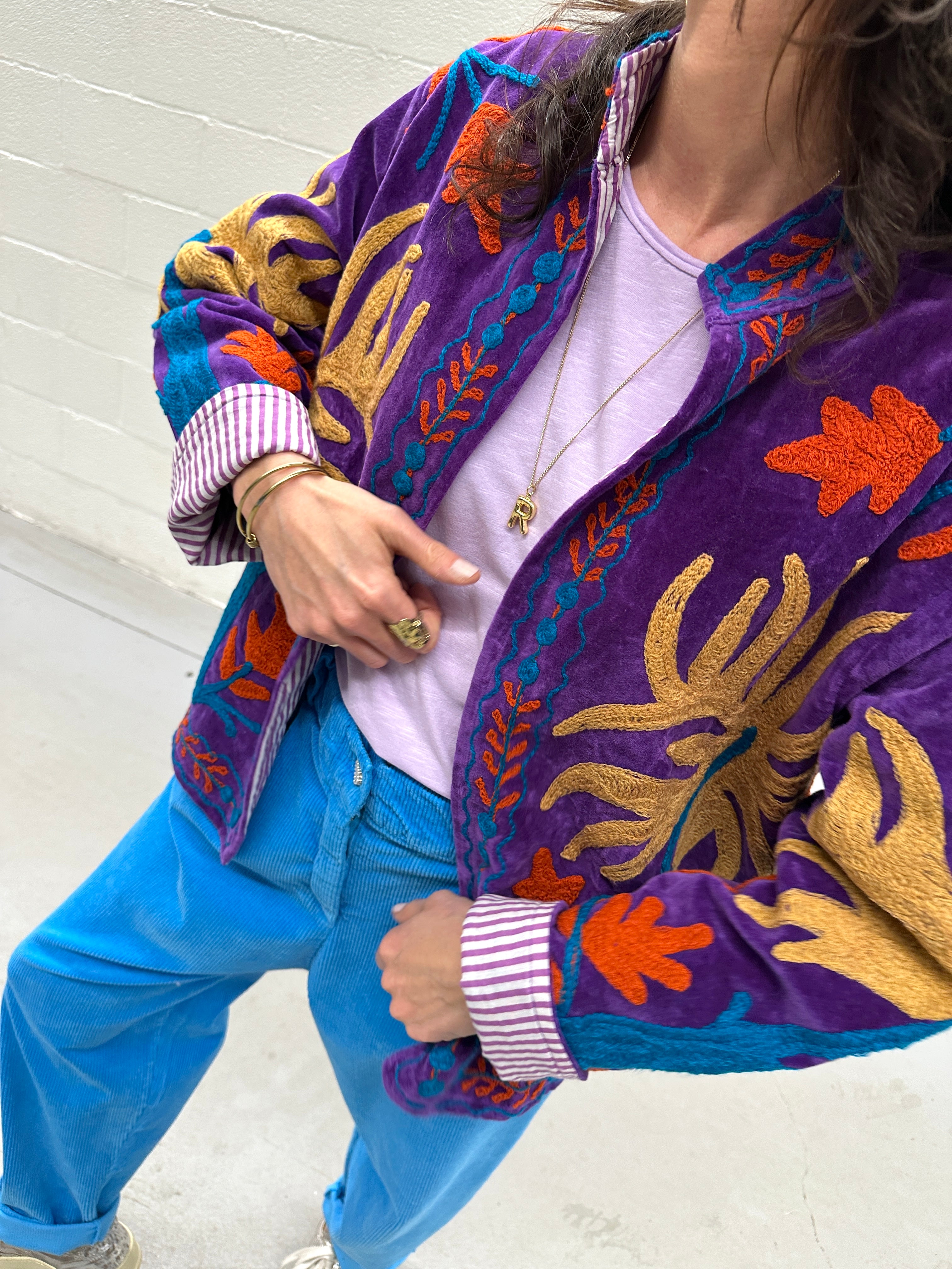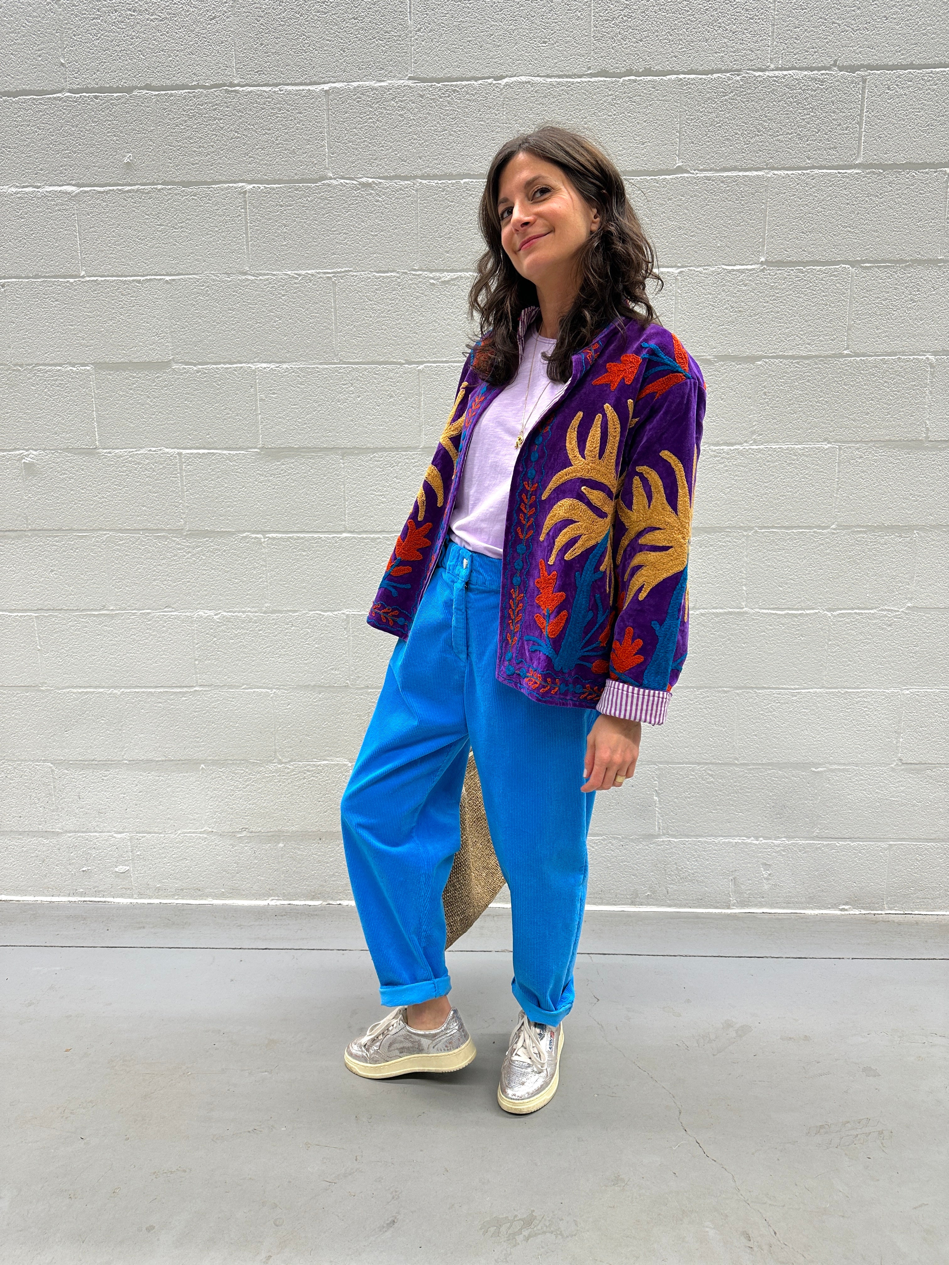 Description : Gros crush pour cette magnifique veste en velours lisse brodée à la main. Pièce unique ! Doublée. Poches sur les côtés. Taille unique.